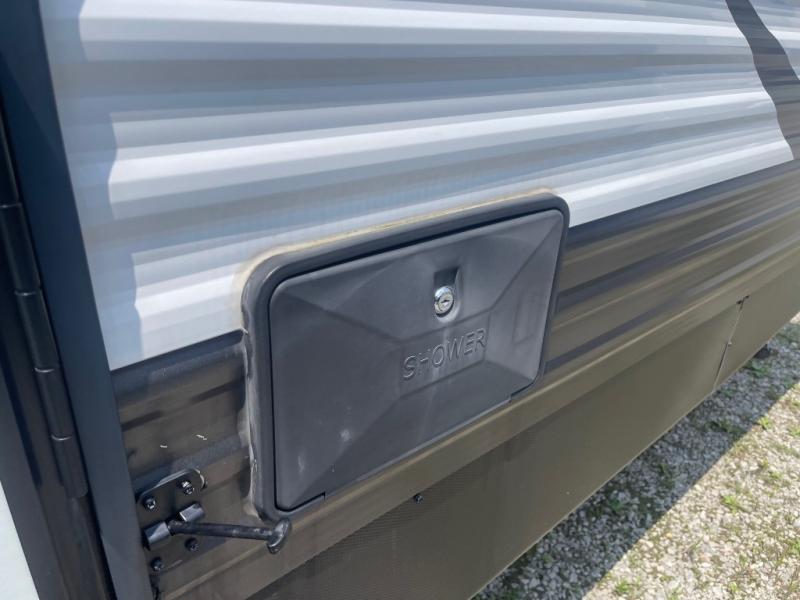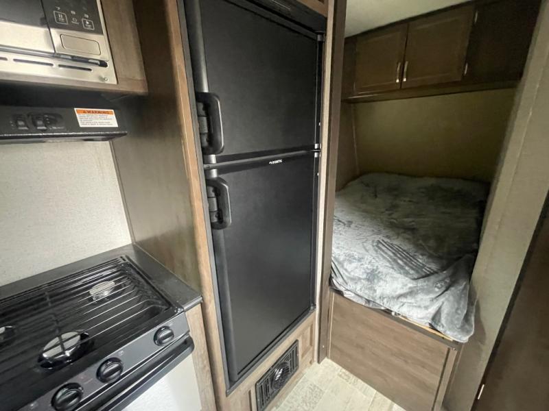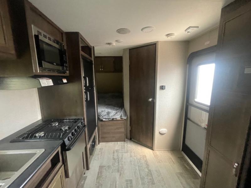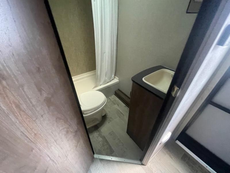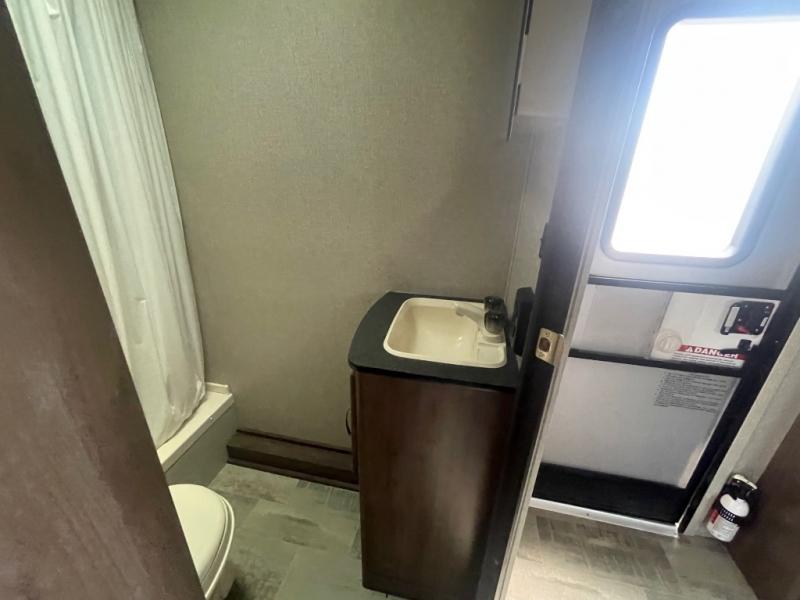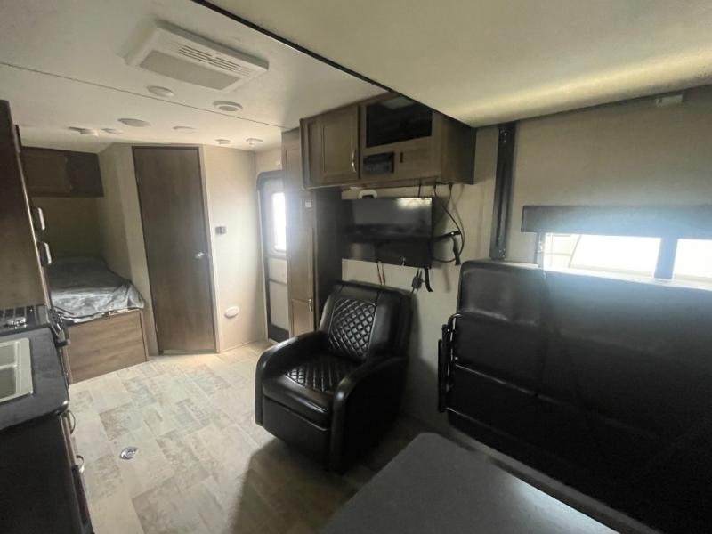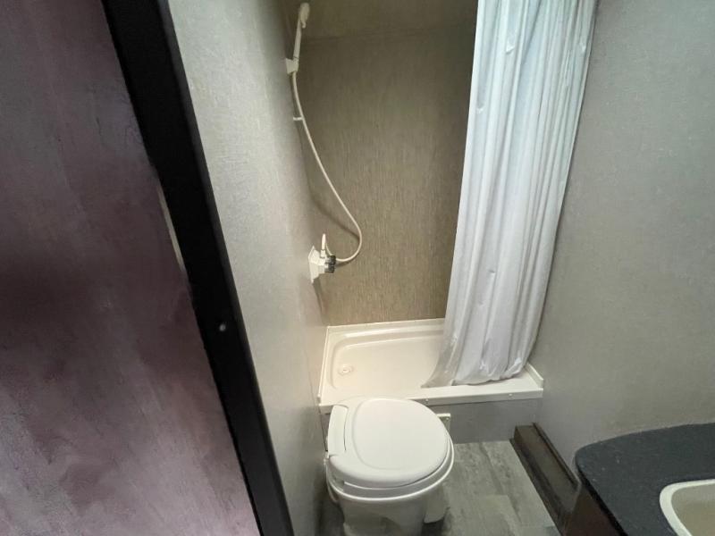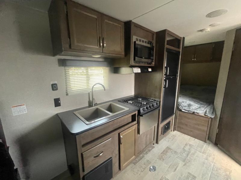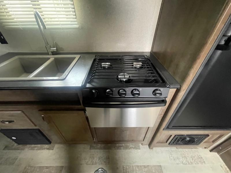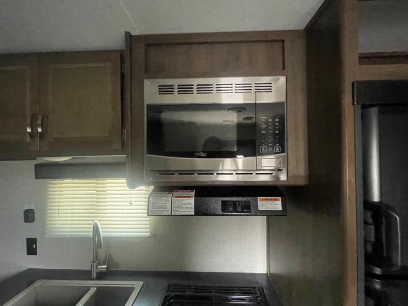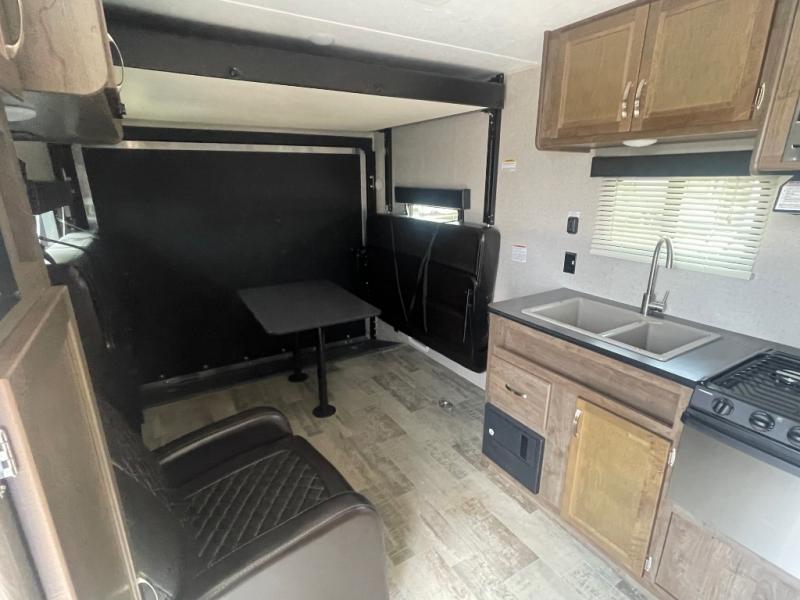 Sleeping for six is easy, thanks to the front corner bed, the Happi-Jack power bunk with sofas, and the convertible seating beneath it. The Happi-Jack bunk stores neatly at the ceiling when not in use, and when lowered, it adds sleeping space for two more guests. The well-equipped kitchen and front corner bath provide all the comforts of home, making it simple to enjoy your time away from home.