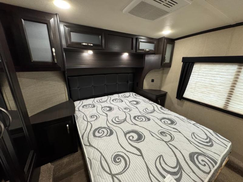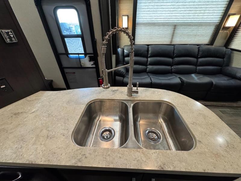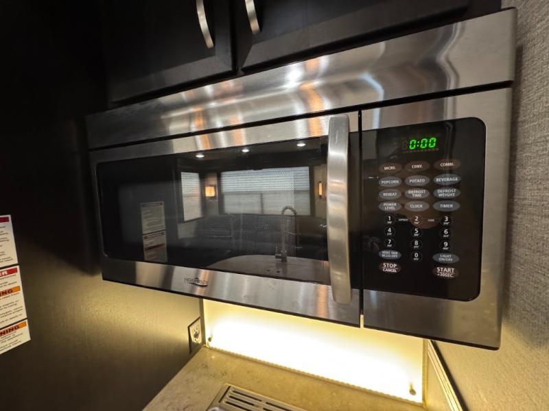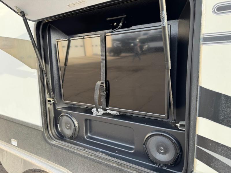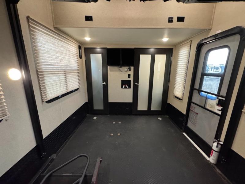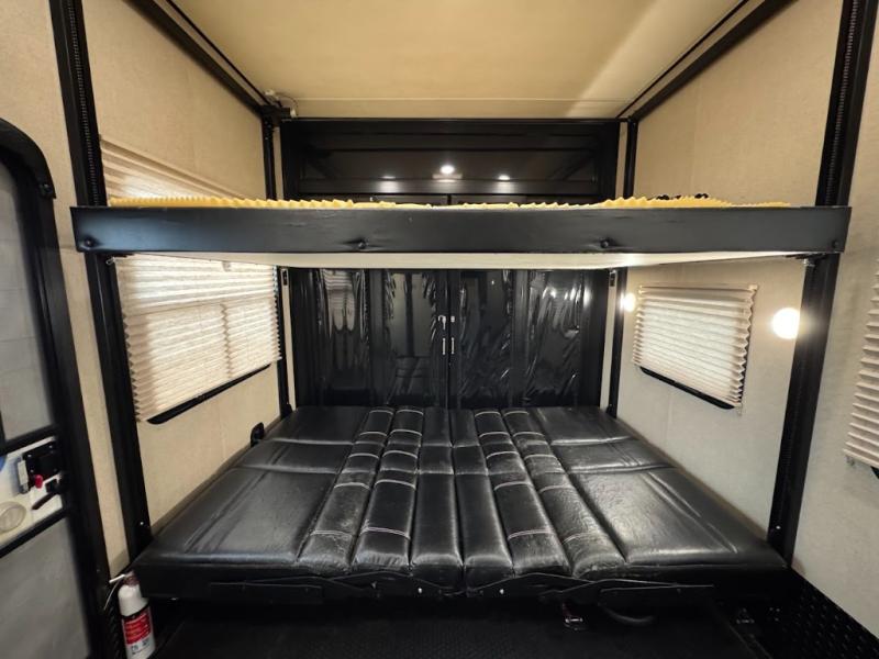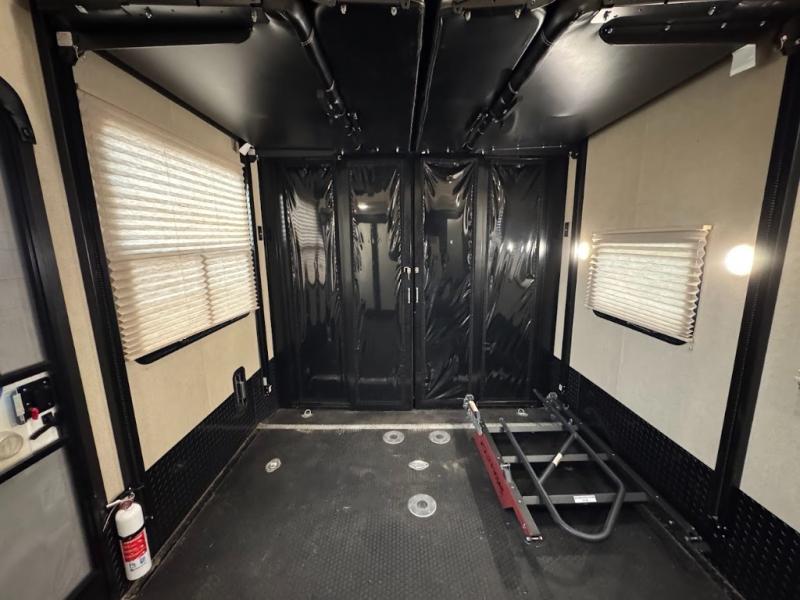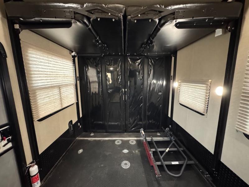 Having some at-home conveniences while you are camped is always a nice touch, but this Voltage FW toy hauler features a few extras that you are sure to enjoy! Eleven feet of cargo space is perfect for hauling dirt bikes, or a quad, and the 30 gallon fuel station makes it easy to keep the fun going all weekend long! Your down time will be enjoyable as well with plenty of seating, sleeping space, and a full kitchen, plus more! Check out the generous storage space toward the front beneath the bathroom and private front bedroom. Here you have storage space that is accessible from both sides, as well as ample wardrobes, overhead cabinets, and storage beneath the front queen bed. For those that love being outside, the outdoor entertainment center offers you a protected outdoor living space you are sure to enjoy! You can even convert the zero gravity garage door to a raised patio with a few options so you can kick back and enjoy the view that you have chosen!