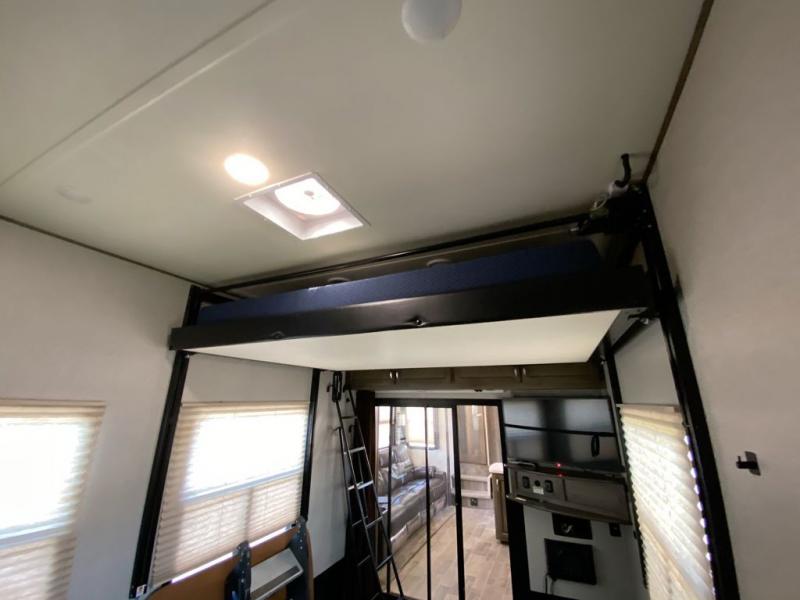 Imagine heading out for a weekend long adventure and taking along 18' of garage space besides a ton of at-home conveniences! With this Dutchmen Voltage FW toy hauler you can have it all! A 30 gallon fuel station provides about as much fun as you can handle, and when you need a break you can make your way back to the comforts of home with a complete kitchen and bath to get cleaned up and get your body refueled for a brand new day. There is sleeping space for eight or more with the rear dual lay-flat Happi-Jack power bunks and convertible sofas beneath the bunk closest to the ramp door. You also have the front master bedroom with queen bed up front for a private retreat away from it all. Dual awnings provide you with about as much protected outdoor space as you have inside so you can enjoy the fresh air even as you relax. There is even an outdoor entertainment center so you can easily enjoy your favorite movie or big game while sitting outside, plus so much more!