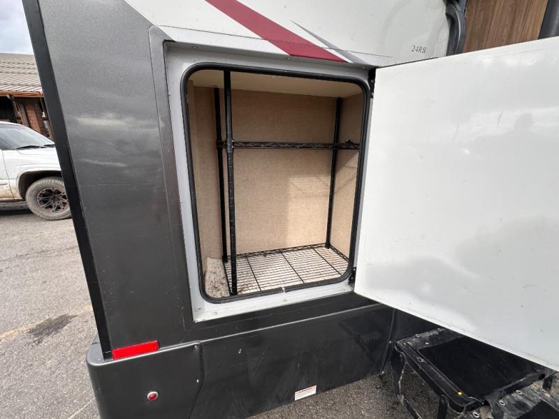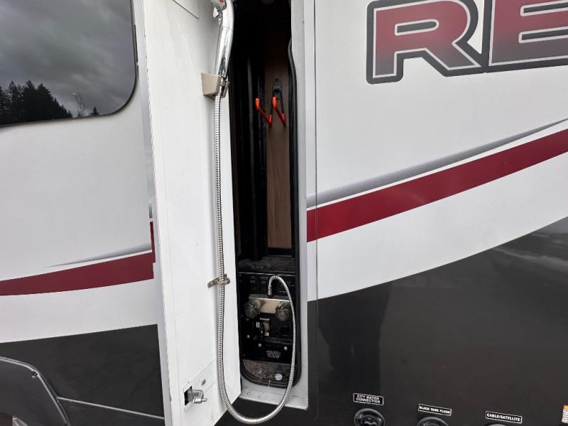 As you enter REV model 24RB you will find that the bathroom is located in the rear. To your immediate left there is a storage wardrobe for clothing, then inside the bath you will enjoy a shower, sink with overhead medicine cabinet, plus a toilet.