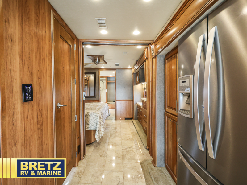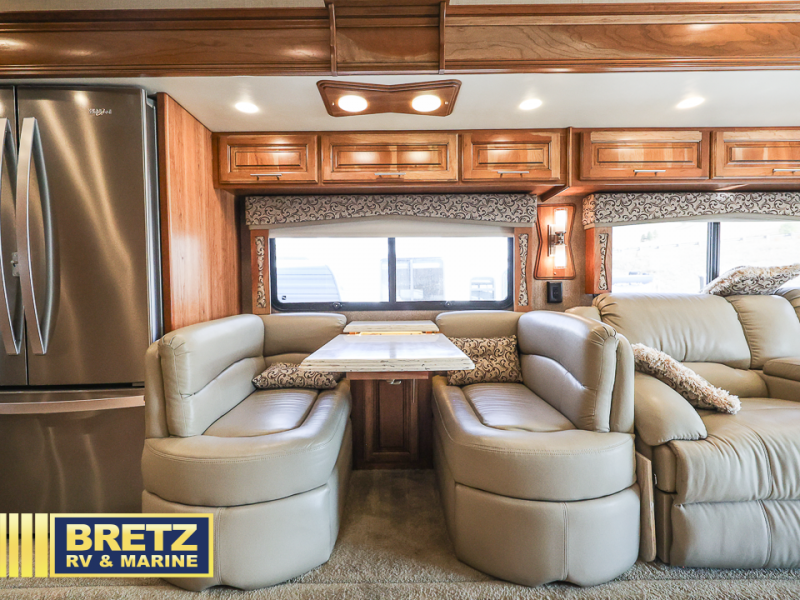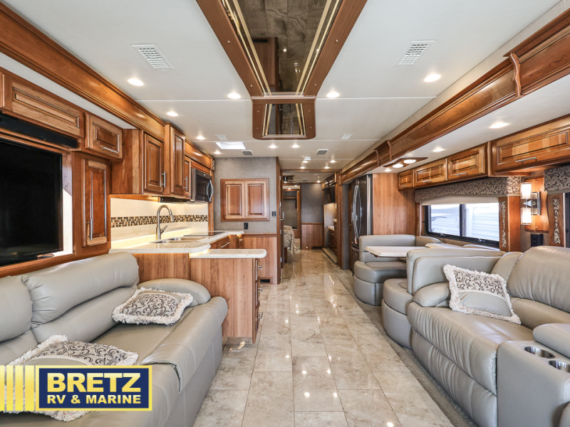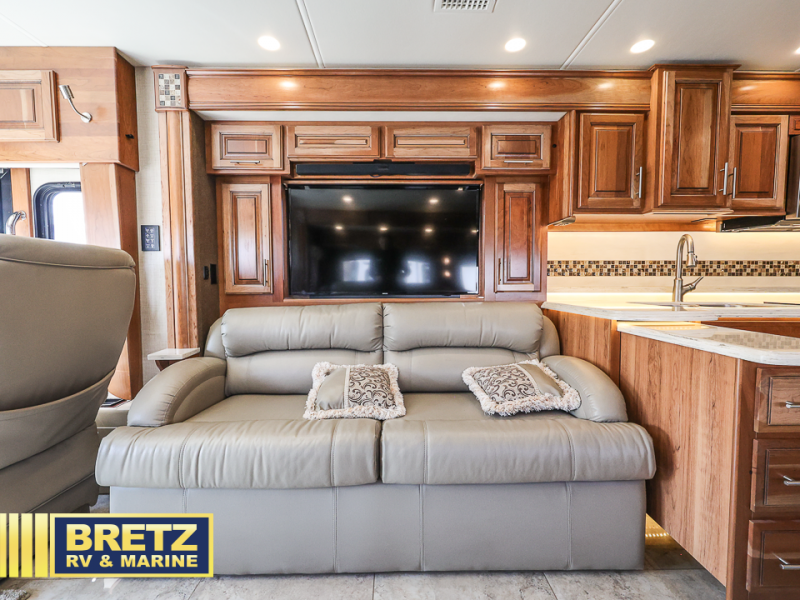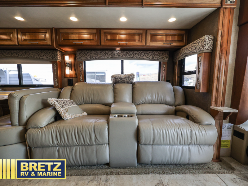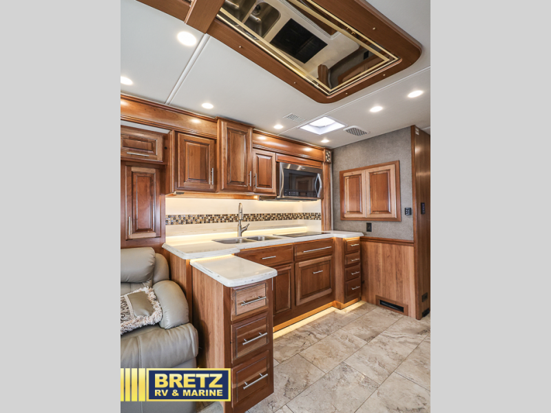 As you enter the passenger side of the motor coach to your left there is a slide out featuring a hide-a-bed sofa with a 50" TV with lift. The slide also includes a double kitchen sink, two burner range, microwave, shelf, and overhead cabinets for your dishes and things. On the opposite side you will see a sofa with two ottomans, a dinette with two chairs, refrigerator, and a pantry inside the second slide in this area. You can choose a booth dinette option and a theater seat option with two power recliners if you like. A 32" TV is in the front of the coach for additional inside enjoyment.