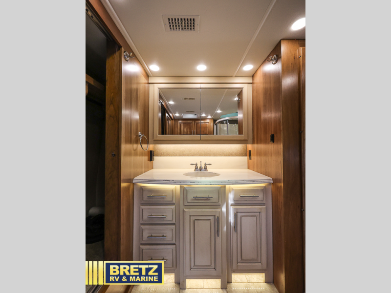 As you head towards the rear of the motor coach, the half bath is on your left which includes a toilet, and vanity with sink plus storage above.