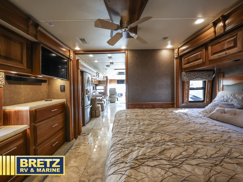 Next, the private master bedroom features a king bed slide with nightstands on either side of the bed plus overhead cabinets. Across from the bed there is a slide out vanity, dresser, overhead storage, and a 32" TV. You will walk through the bedroom to enter the full bath.