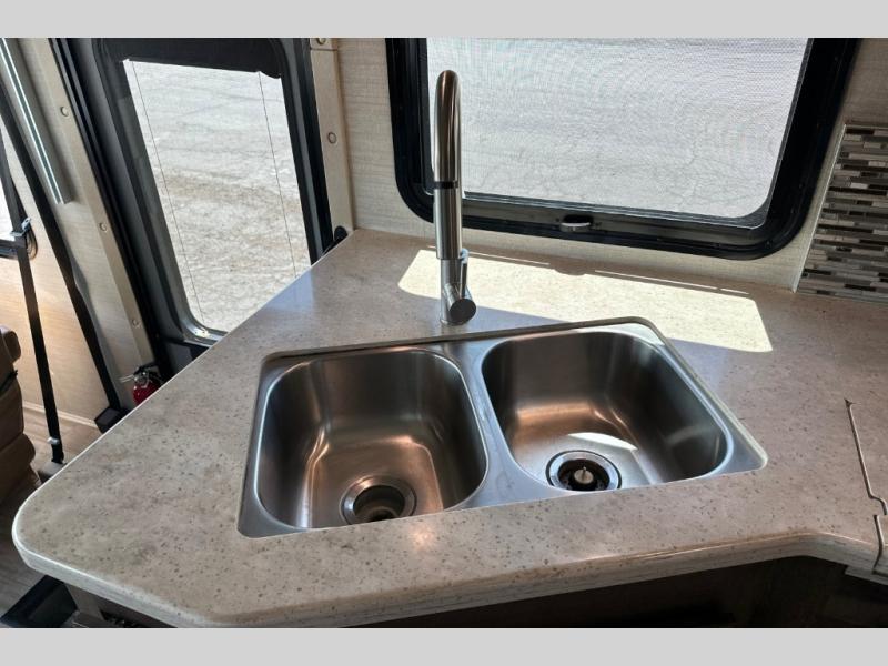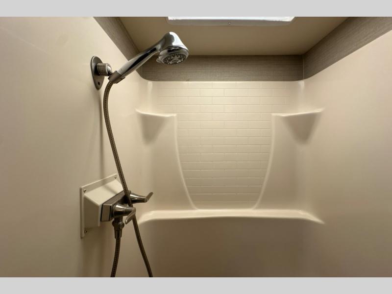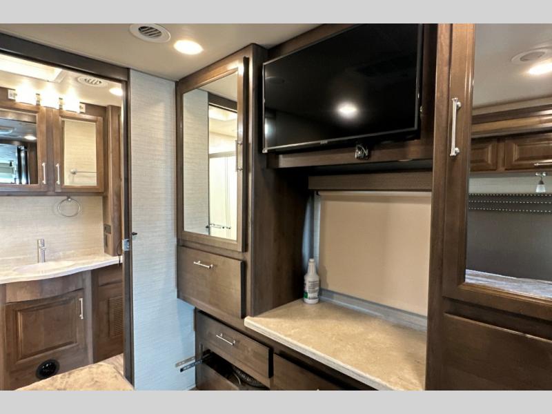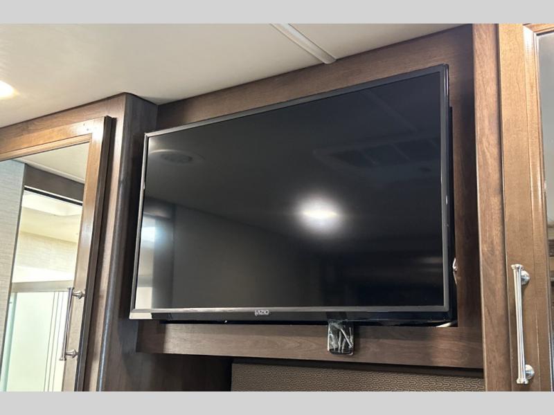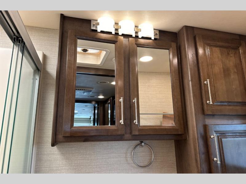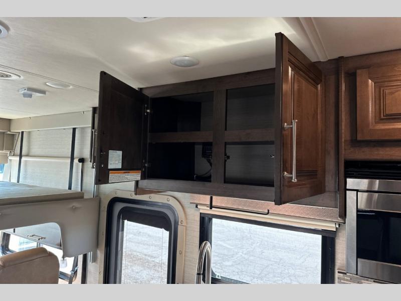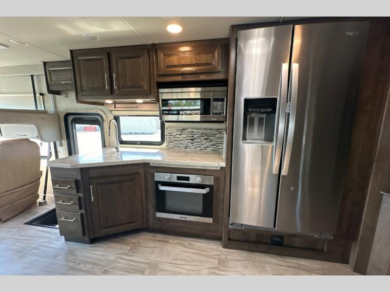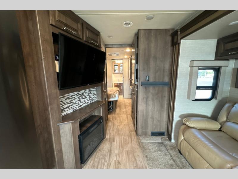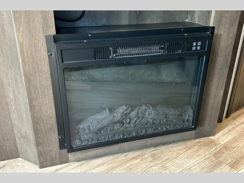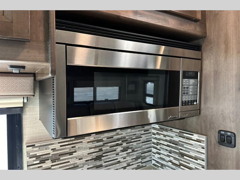 The residential feel of this coach not only promises comforts and conveniences for your entire journey, but the look and feel once you step inside tells you that luxury living is going to be your new way of travel. You are going to enjoy the spacious interior thanks to two nice size slides. Once parked, and the slides are opened up, sink back into the extendable sofa and enjoy a cozy fire in the fireplace as you watch your favorite program on the 39" LED TV provided. All of the residential appliances will make it easy to cook gourmet meals just like home. And, at bedtime, a king bed is waiting to whisk you off to dreamland! The rear bath offers privacy from the main living area up front, and there is also a half bath easily accessible during the day. Outside, you will find tons of storage space with a lockable pass-through compartment that makes packing and storing your outdoor gear easy, and the 17' electric awning with outside entertainment center provides a place to hang out both day and night protected from the elements while enjoying a bit of fresh air. You also have the option of adding a drop-down overhead bunk for added guests that wish to spend the night, plus so much more.