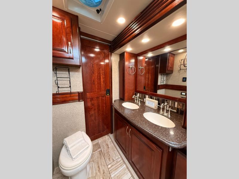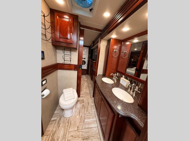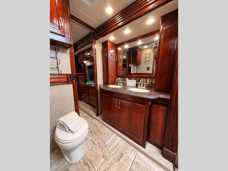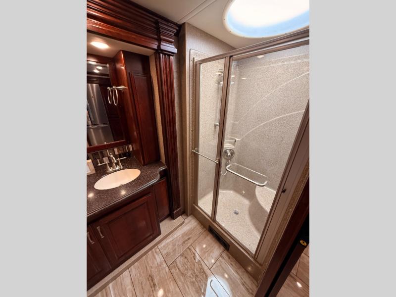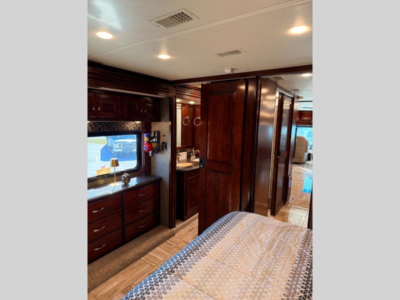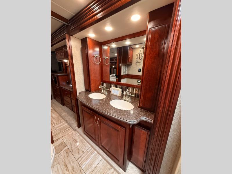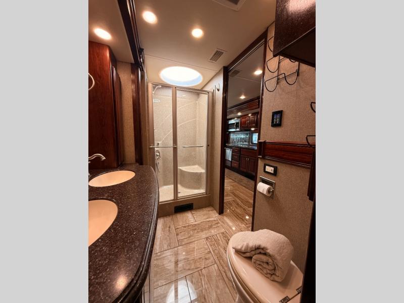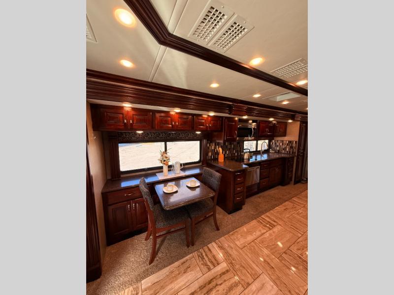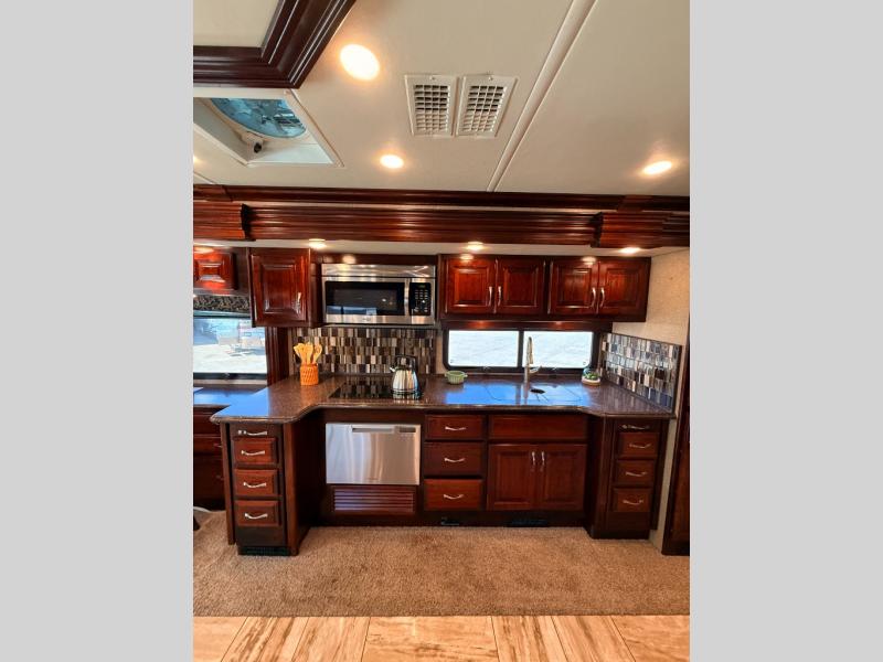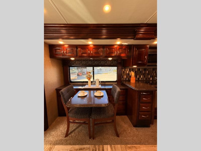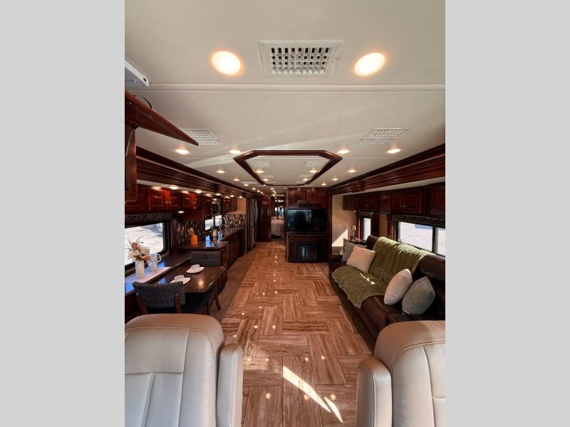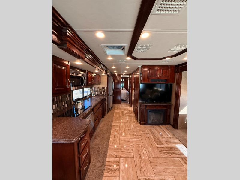 This Discovery LXE 39F class A diesel coach offers several standard upgrades you will enjoy while moving down the road, and at your destination. You can work and eat on the dinette with credenza, relax on the L-shaped transformer sofa and chair, and watch the 49" LED TV with fireplace below. If you enjoy cooking you will love the kitchen amenities including a residential refrigerator. The convenience of having dual sinks in the bathroom allows two people to brush their teeth at the same time. You will find plenty of storage throughout, plus much more!