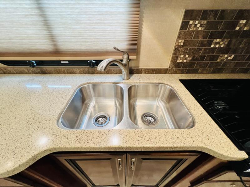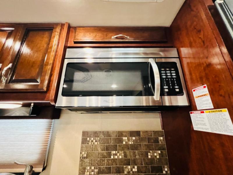 As you step inside notice the kitchen to your left which features counter space, plus a 32" LED TV overhead. There is a double sink, a three burner range with overhead microwave oven, and a refrigerator for your perishables. You will also find plenty of storage in the overhead cabinets for dishes and things.