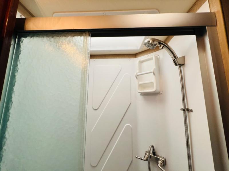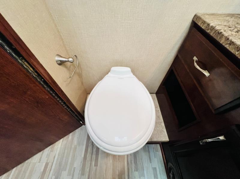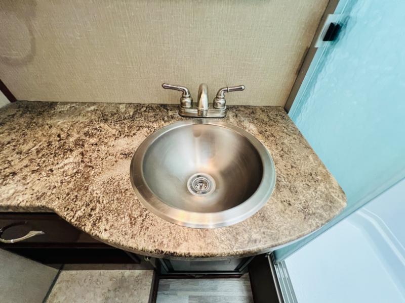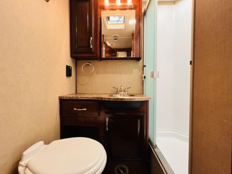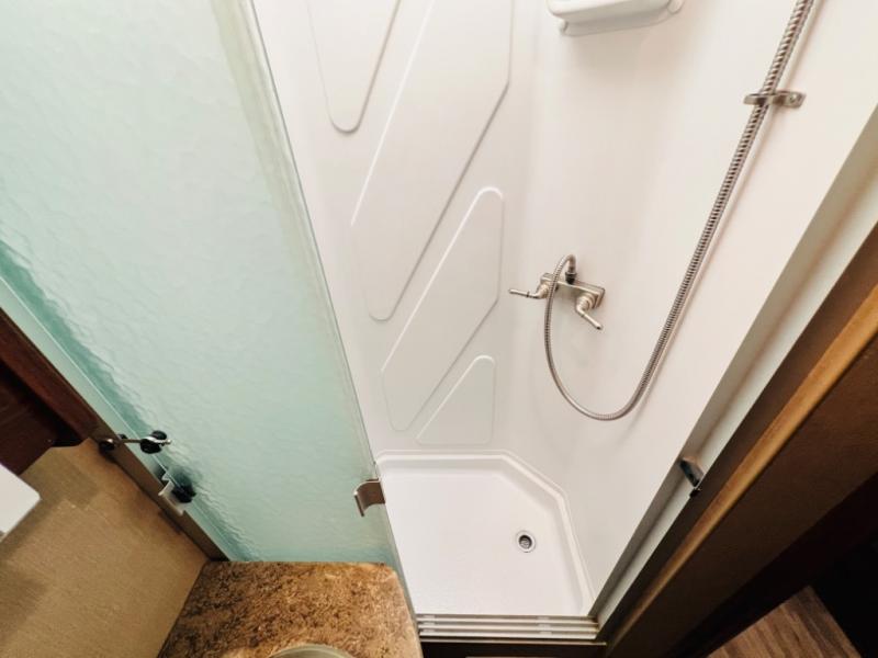 Beyond the slide out and kitchen area you have a complete bath including a shower, vanity with sink, toilet, and overhead medicine cabinet. There is also a pantry just outside the bathroom door.