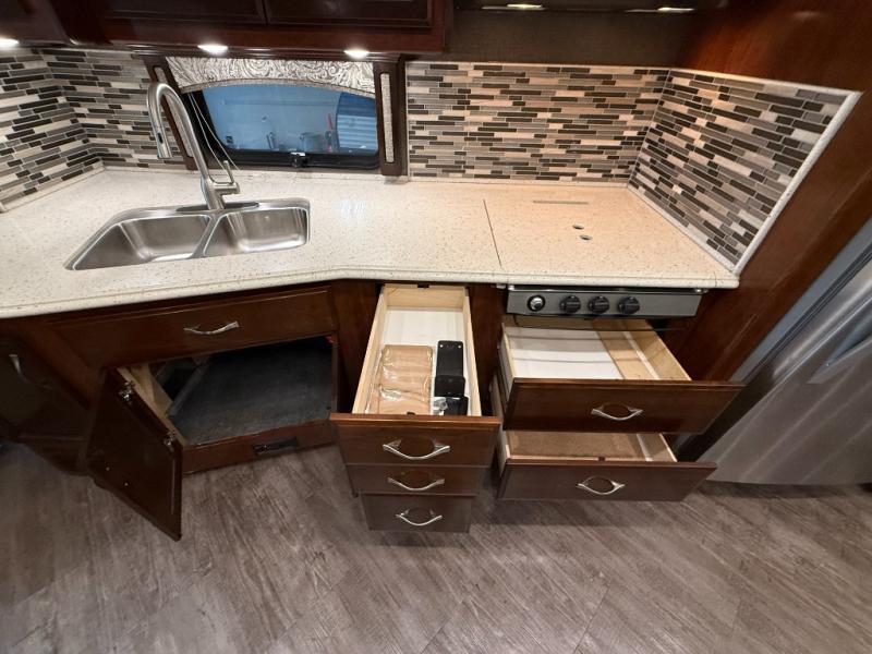 With any Fleetwood Pace Arrow LXE model you will experience luxury oozing from every area! These class A diesel coaches are bringing you class A comfort and conveniences, along with plenty of technology and power, to take you anywhere in America you dream to go. These units feature the industry's largest pass-through chassis storage thanks to the Power Bridge raised-frame design. This also allows for oversized heated and enclosed water tanks as well. Besides heated and enclosed tanks for weather protection, the coach also features solid bead-foam engineered fit insulation. With your choice of an exterior full body paint color scheme your neighboring campers will be begging to get a look inside. What they will find is a luxurious coach starting with wall-to-wall 12" x 24" plank style flooring, hardwood cabinetry, and residential soft-touch furnishings. The 84" ceiling height will also make it feel open and spacious just like home along with having a residential refrigerator, full mosaic glass tile back-splash, solid surface countertops, plus large screen televisions, and even a fireplace in select models. Come choose your fully loaded luxury class A diesel Pace Arrow LXE today, and enjoy your very next journey!