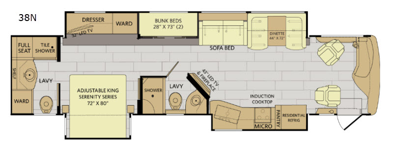 Oh the places you will go in this Fleetwood Pace Arrow LXE diesel motorhome model 38N! Your family will love traveling in this spacious home on wheels with bunks for the kiddos, and a comfy adjustable Serenity Series king bed for the adults! Triple slides in all with the driver's side being a full wall slide really opens up the whole interior creating an at-home feel. You will love the residential touches and soft-touch furnishings. Seat belts on all rear seating makes it safe while you are moving down the road for your rear travelers. Once parked, you will find at-home conveniences throughout. You are sure to enjoy the rear master bedroom with full on-suite bath, as well as having an additional second full bath for the children or other guests mid-coach. The kitchen is great for providing healthy meals and includes a standard residential refrigerator plus an induction cook-top with microwave oven. You will also love the ambiance and warmth that the fireplace adds on cool chilly nights indoors. And, besides all of the interior storage you will find throughout with the many wardrobes, pantry cupboards, and overhead cabinets, the exterior storage at 156 cu. ft. is pretty phenomenal as well!