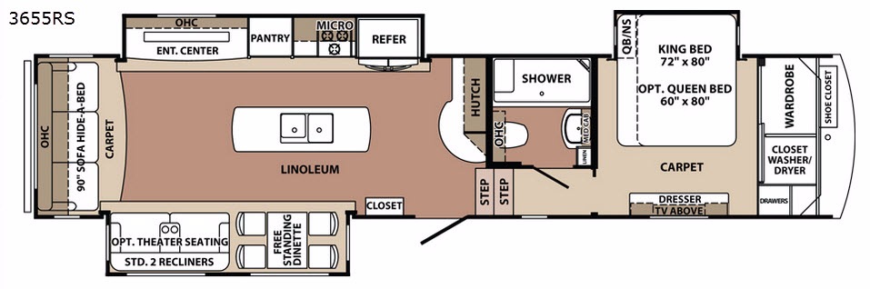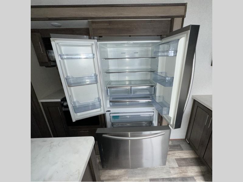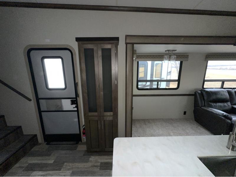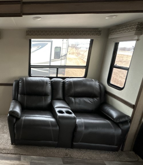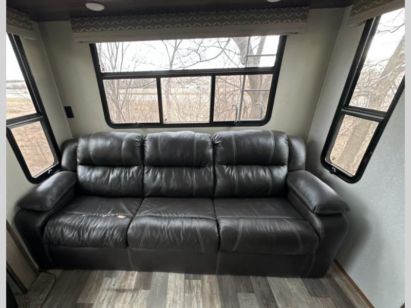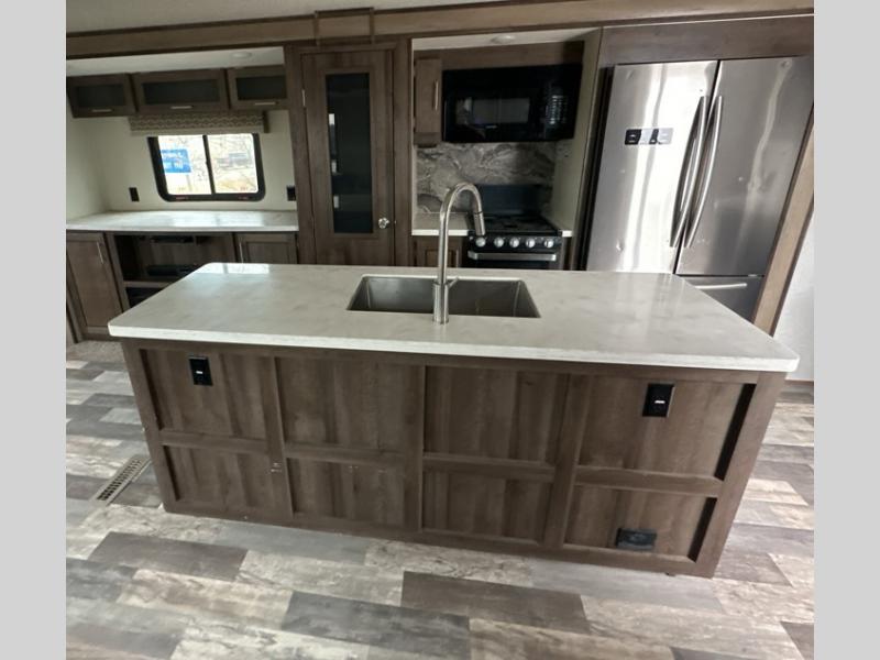 Are you ready for your next vacation? Well, come step inside the 3655RS Blue Ridge fifth wheel by Forest River and find that this model has everything that you need, from triple slide outs to a kitchen island, you can camp in comfort and style. You will have plenty of seating options between the two recliners, free standing dinette, and hide-a-bed sofa which can be converted into an extra sleeping space too. In the front bedroom, there is a premium innerspring mattress for the king size bed or you can choose the queen size bed with nightstands on either side. Keep the nights rolling underneath the 19' electric awning with LED lights.