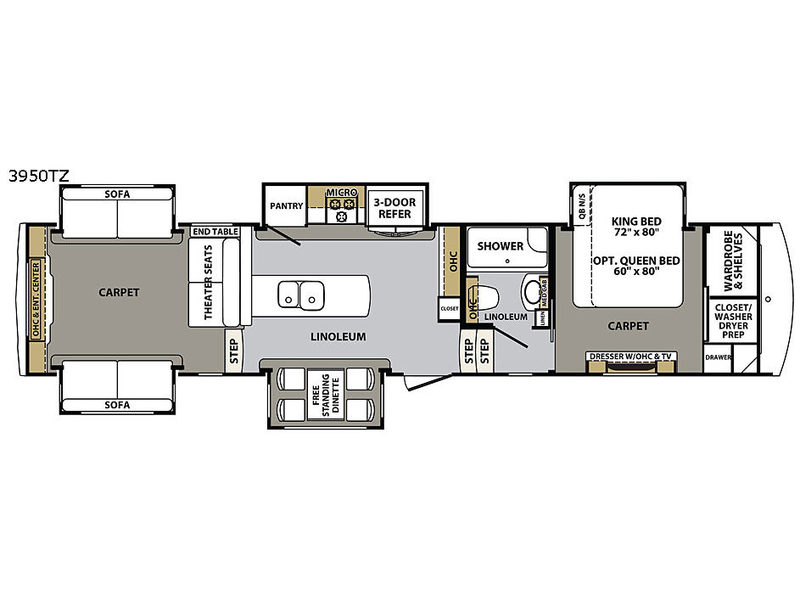 As you enter model 3950TZ you will find yourself in the kitchen area which features dual opposing slide outs. To the left of the entry door you will find a slide out free standing table with four chairs. Along the opposite side of the kitchen there is another slide featuring a pantry, a three burner range with overhead microwave oven, and a three door stainless steel refrigerator for your perishable items. Along the interior wall you will find plenty of storage besides the extra counter space with a large peninsula found opposite the dining table. The peninsula also features a double kitchen sink.