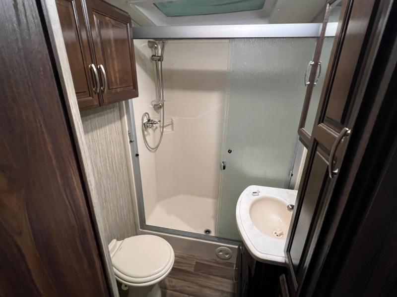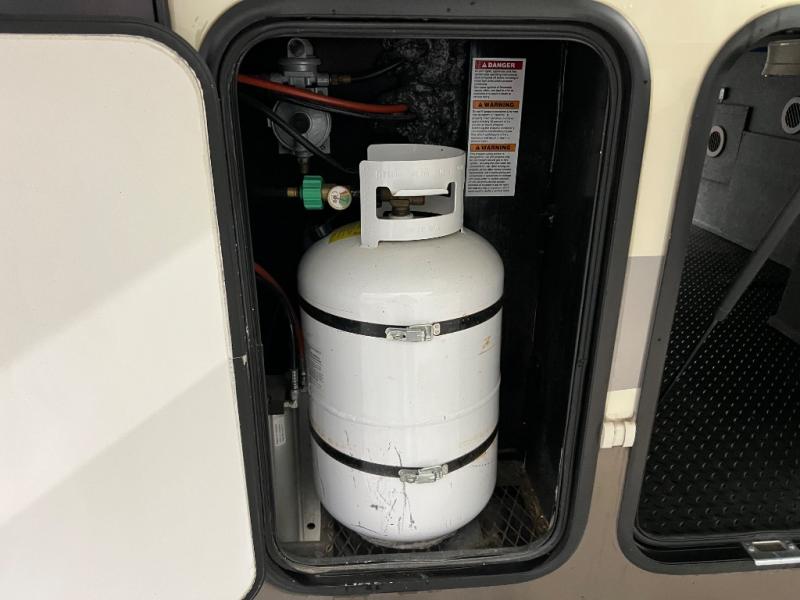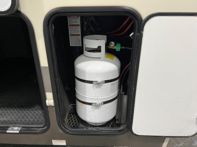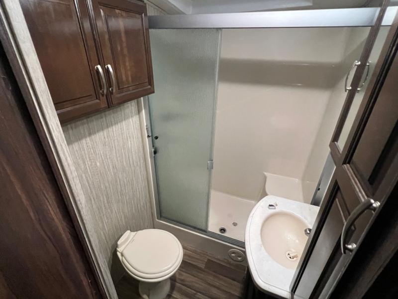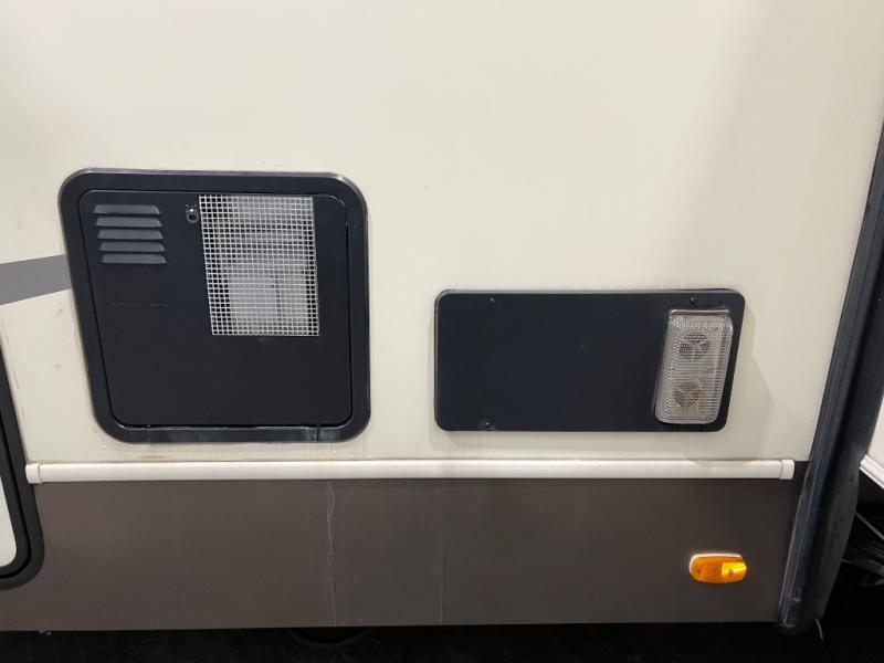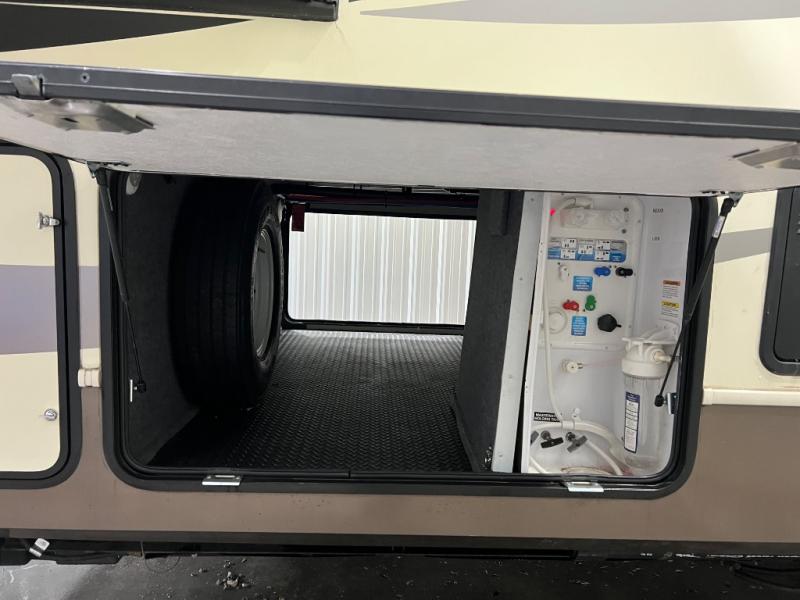 Step up to a rear living area where you can gather with your whole family at the end of the day. Inside this space you will find dual opposing slide outs creating a nice size room when fully extended. Along the interior wall you will find a theater seat for two with an end table along the road side, and along the rear wall there is an entertainment center with overhead cabinet which includes a 58" LED TV
