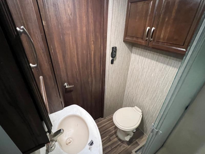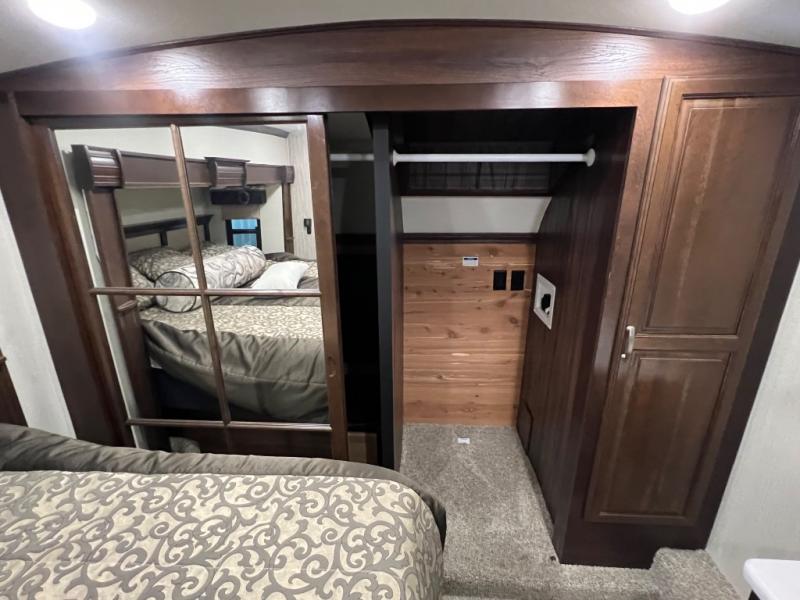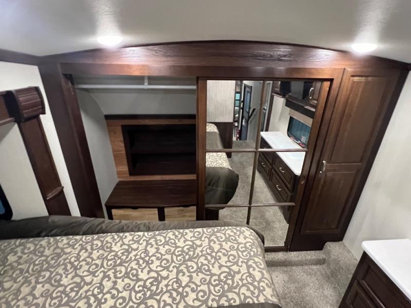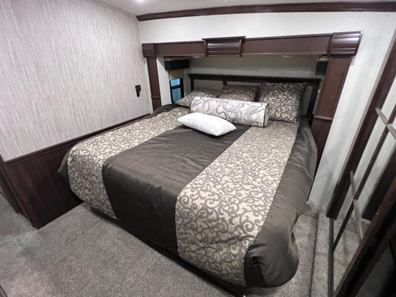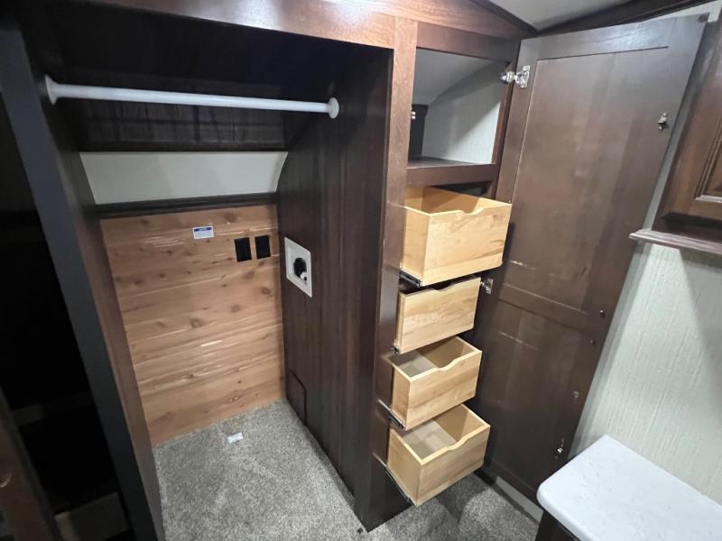 The master bedroom provides a relaxing retreat away from the hustle and bustle of the rest of the unit. Here you can enjoy a slide out with a king size bed, or you can choose an optional queen for a bit more walking around space inside, plus you will gain a nightstand closest to the door. Across from the bed there is a dresser with a 32" LED TV above. Along the front wall you will find a wardrobe for your hanging clothes, plus some shelves, as well as a closet that has been washer/dryer prepped for your convenience, and a set of drawers, plus so much more!