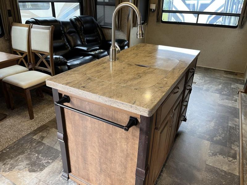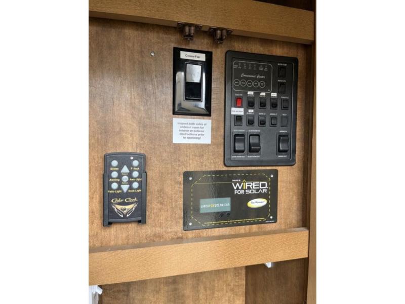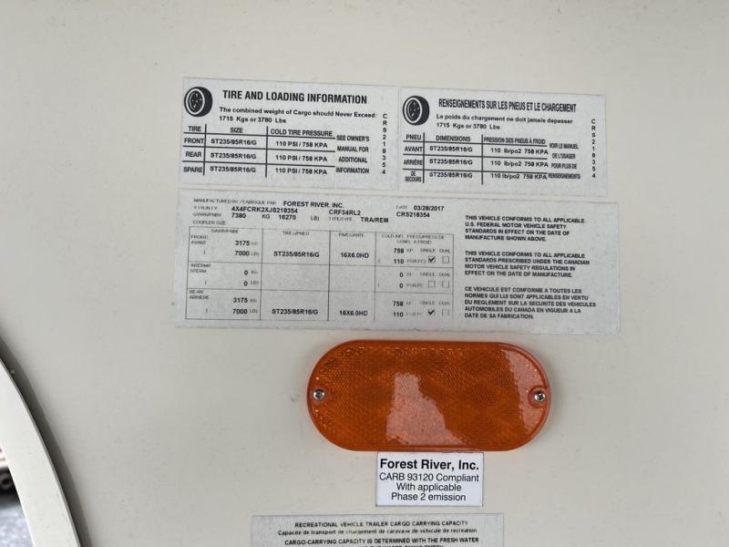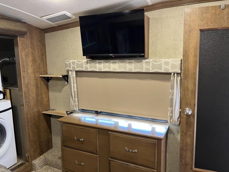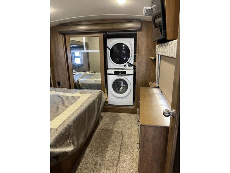 Come see just how fun and comfortable your next camping trip can be with this 34RL2 Forest River Cedar Creek Hideaway Edition fifth wheel. With triple slide outs you will have plenty of living space throughout this model for your family of four. The combined kitchen and living area have plenty of space to relax plus there is a 55” LED TV, fireplace, and plenty of kitchen amenities such as a three burner range, 19 cu. ft. stainless steel refrigerator, and an island with a double sink. In the bathroom you can easily get ready for your day. Here you will find a toilet, sink, medicine cabinet, and a shower with a seat. Retreat to the front bedroom where you will find a queen bed, plenty of storage with the dresser and the large front wardrobe plus there is an area in the wardrobe that has been prepped for a washer and dryer and more!