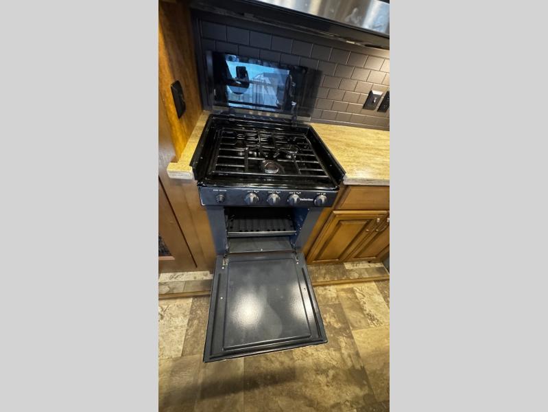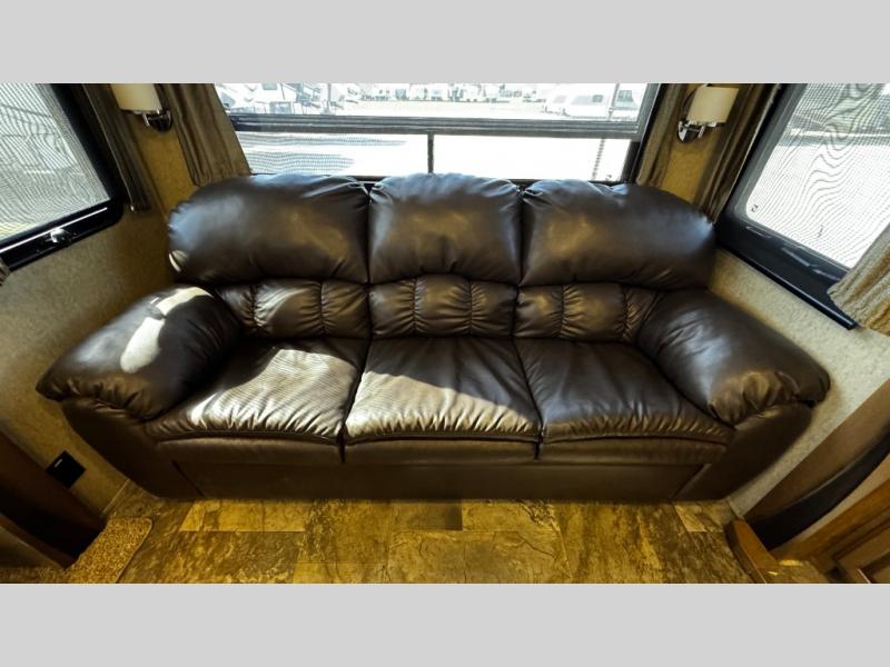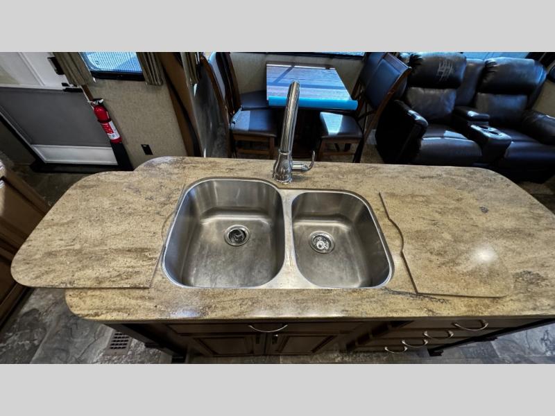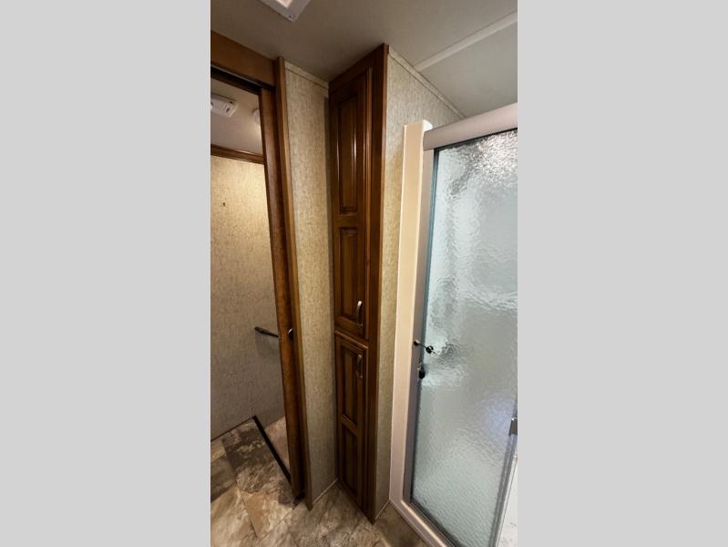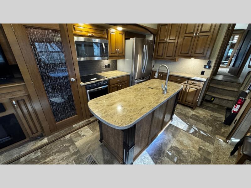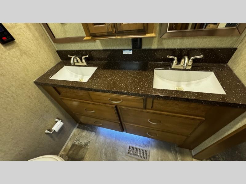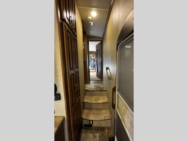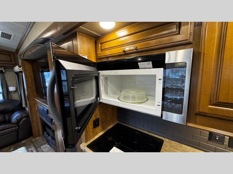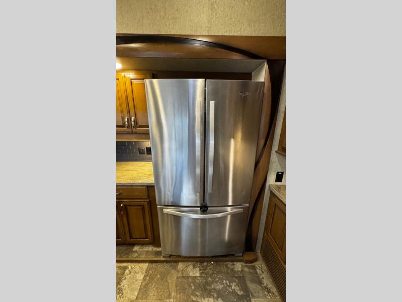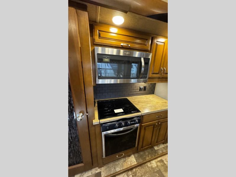 With any Forest River Cedar Creek Hathaway Edition fifth wheel you will find Nev-R-Adjust brakes which allow for improved stopping power in half the distance. There is also an E-Z Lube rubber equalization system and E-Z Lube heavy duty axles. In the bedroom you will find extra wide mirrored closet doors plus a walk-in closet and the radius ceilings give added headroom. The kitchen is everything that you would expect to find and more from the stainless steel 30" over the range microwave, to the recessed stainless steel large oven, you won’t be disappointed! If you prefer a bit more conveniences throughout then you will enjoy the Hathaway Edition Package which includes a 36" fireplace with remote and storage, solid surface LG counter tops with an oversized stainless steel sink, Congoleum Carefree designer flooring.