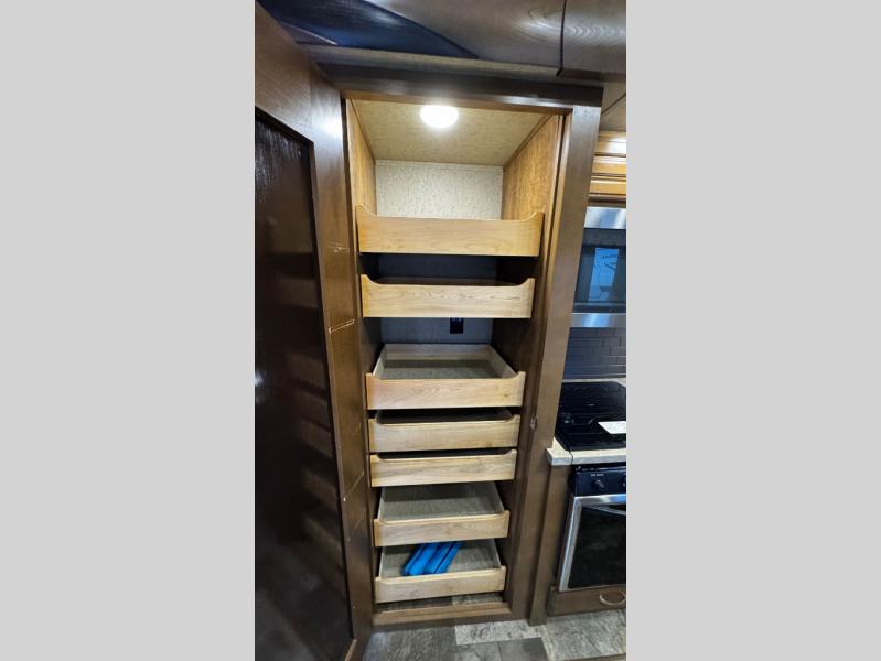 Bring all of the comforts of home with you when you choose to camp with this triple slide out Cedar Creek Hathaway Edition 36CK2 fifth wheel. In the kitchen there is plenty of work space to prepare your favorite meals. Clean up is a breeze at the island. Here you will find a double sink plus if you choose to add the optional dishwasher then your time cleaning up will be cut in half! When you are ready to call it a day, then head up to the private front bedroom. Here you will find a king bed and plenty of storage with the large wardrobe and dresser. This room has also been prepped for a washer and dryer so now you can easily keep up with your laundry while you are away from home!