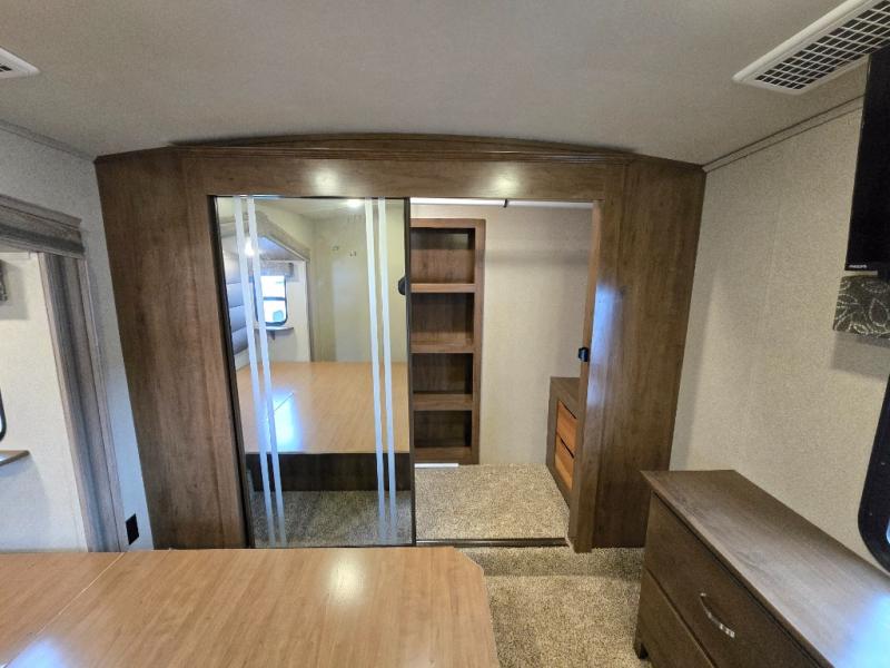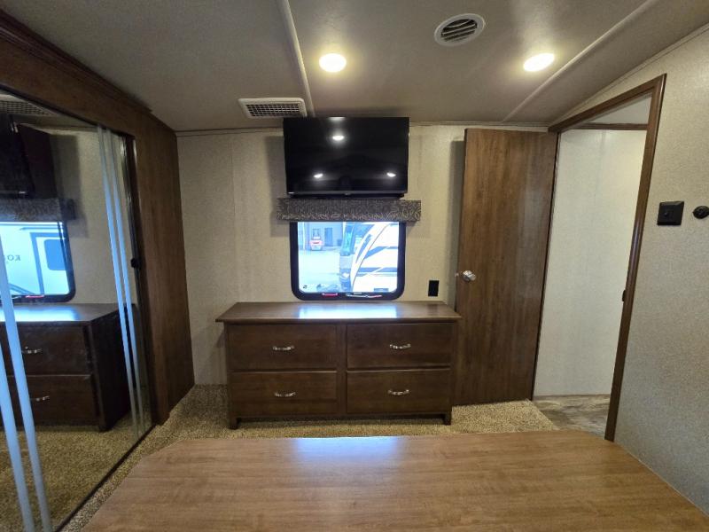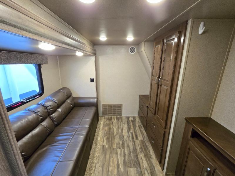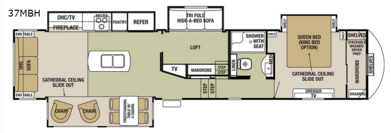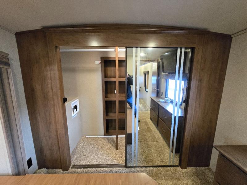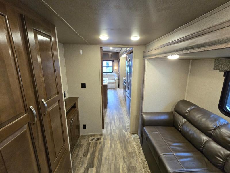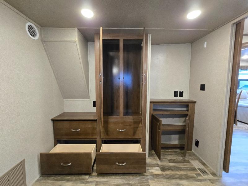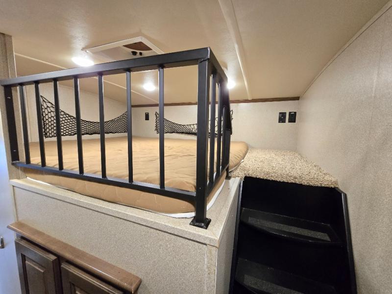 With two bedrooms plus a loft your whole family will enjoy their next camping trip in style and comfort with this quad slide out Cedar Creek Silverback fifth wheel 37MBH by Forest River. Come kick back and relax in the rear living area. You can easily watch TV at the 50” LED TV plus below there is an electric fireplace. Fixing meals for your family is a breeze with this kitchen. You will find an island with a double sink and plenty of amenities such as a 19 cu. ft. stainless steel refrigerator, a spacious pantry, a three burner range, and a 30” over the range microwave. Just off of the kitchen is the bunk room where you can easily sleep two people. In the hallway at the top of the stairs there is another set of steps which leads to the loft which will be a fun hang out spot for your kids. When mom and dad are ready to turn in for the night come do so on the Serta queen bed in the master bedroom. There is also plenty of storage space with a dresser and a large front wardrobe, plus so much more!