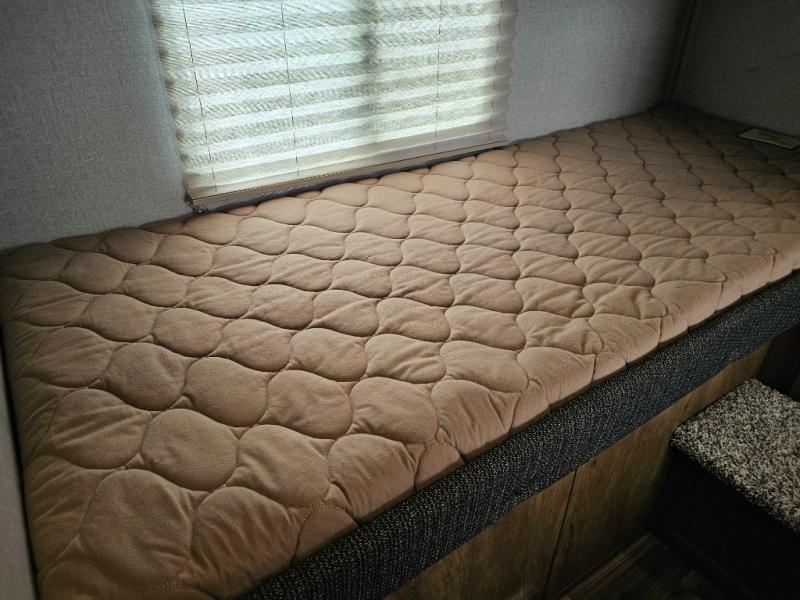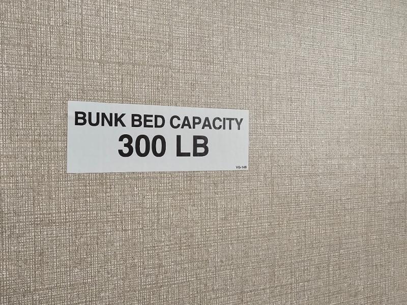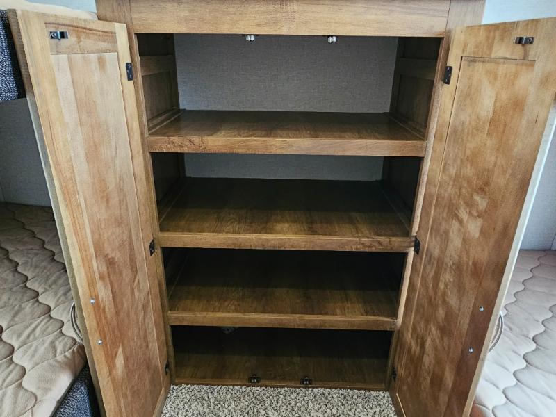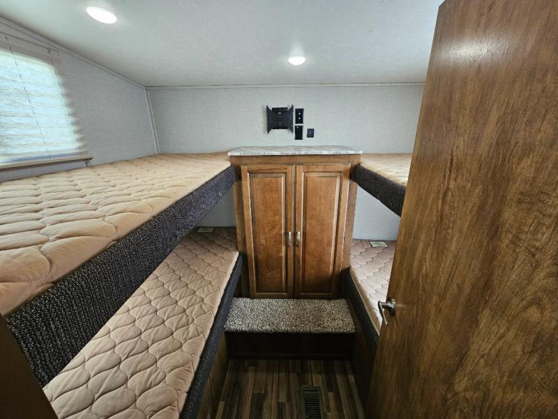 Rear private bunkhouse with two sets of 30" x 74" bunks, separated by a step-up wardrobe for organized storage