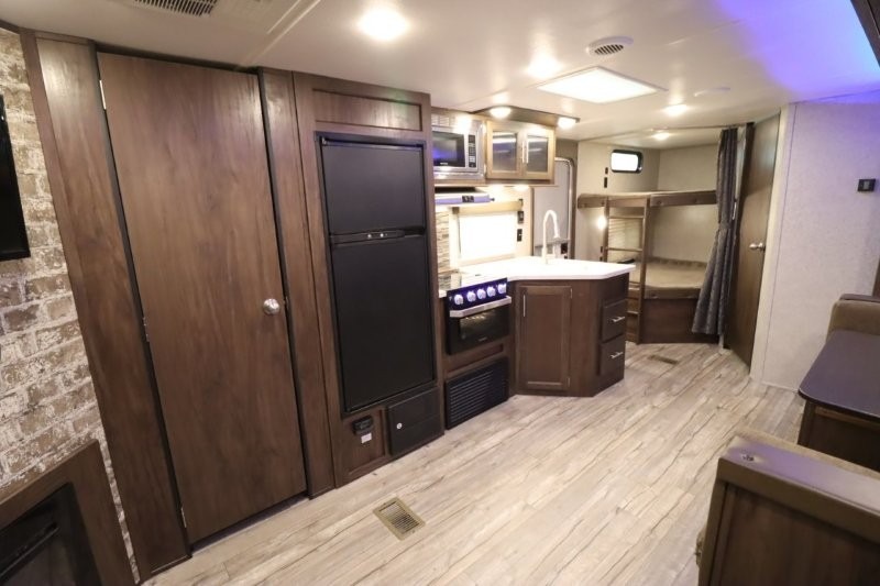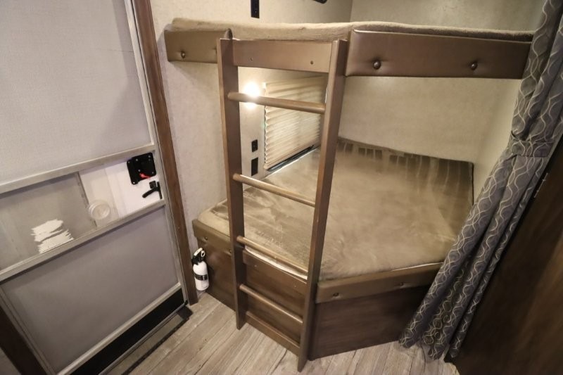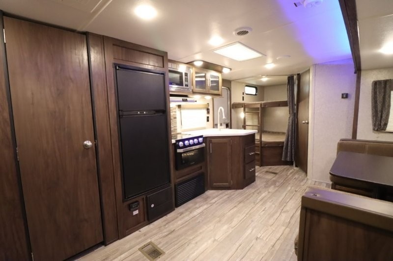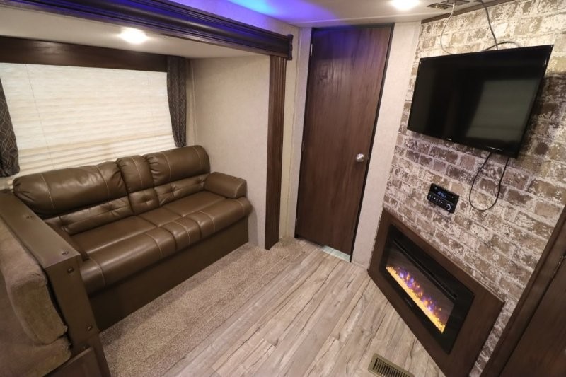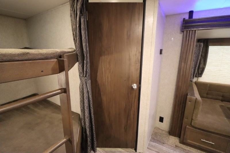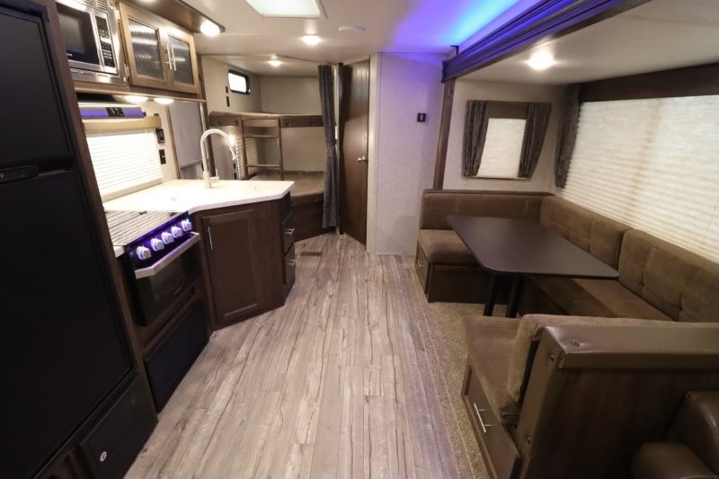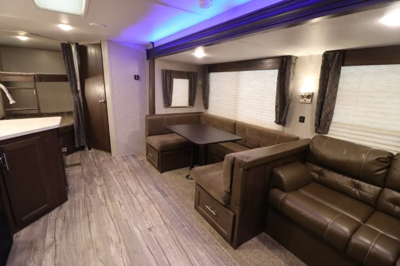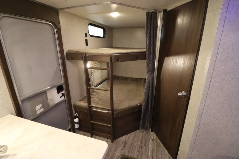 This Cherokee travel trailer can certainly house a bunch of campers looking for a fun weekend get-a-way! With double bed bunks, a queen size bed, plus a sofa and an oversized u-shaped dinette you will have easy sleeping for nine! So, gather the family and a few extra friends and head out for a great time to explore, relax, and just simply enjoy! You will find the large slide out provides a nice amount of space in the main living/dining area. The u-shaped dinette allows for several to sit comfortably for meals, games, or just to gather for a great conversation about your day. The private front bedroom features its own private entry door as well, and you will also find this unit provides loads of storage for your gear and necessities both inside and out!