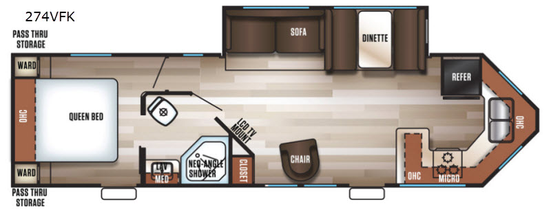 Are you ready to head out on a quiet retreat away from the hustle and bustle of life? You will want this single slide out Cherokee 274VFK travel trailer! This model has a v-nose design which allows for better aerodynamics while traveling. Located in the front of this model is the spacious kitchen. Once you set up camp, then come relax indoors at the dinette, sofa, or lounge chair. With two entry doors you can easily slip out for an early morning fishing trip without waking any sleeping campers!