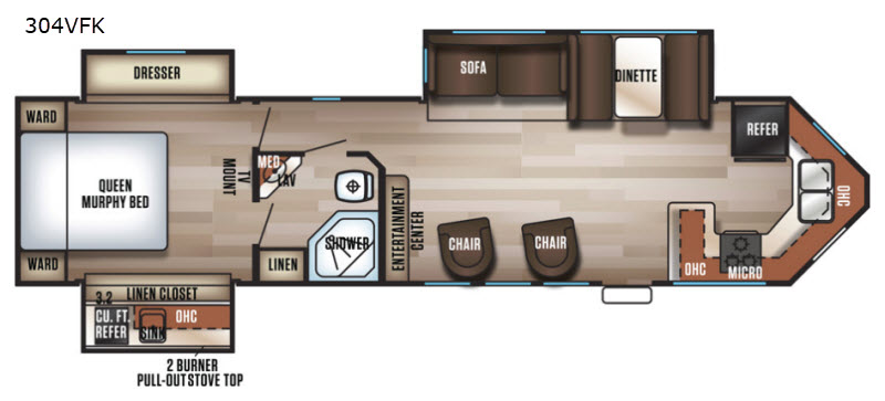 This Forest River Cherokee provides a unique style with the v-nose design and triple slide outs. Model 304VFK features a front kitchen layout with plenty of counter space and appliances for making meals wherever you land. You will find two chairs, and additional seating in the living area slide out for visiting with other campers. The private rear bedroom includes two slide outs, a queen size Murphy bed, and a complete bath including double door entry with easy access from the hallway as well. The chef in the family even gets to choose to cook inside or at the exterior kitchen.
