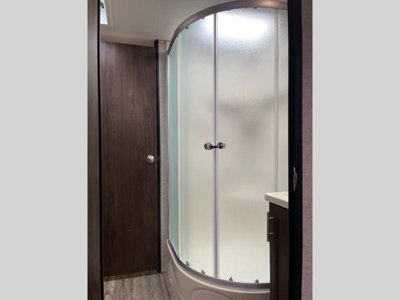 The bathroom is a walk-through style with a sink, and a corner shower along the door side of the trailer. The opposite side of the trailer features the toilet and wardrobe.