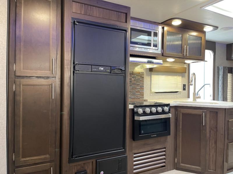 As you enter the travel trailer, there are two lounge chairs along the rear wall with an overhead cabinet above. The slide has a sofa with a hidden bunk above, and dinette. Along one wall there is an entertainment center. The other side has a large sink, three burner range, microwave, refrigerator, and pantry.