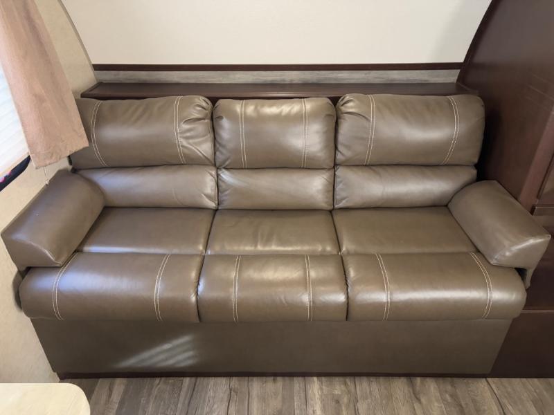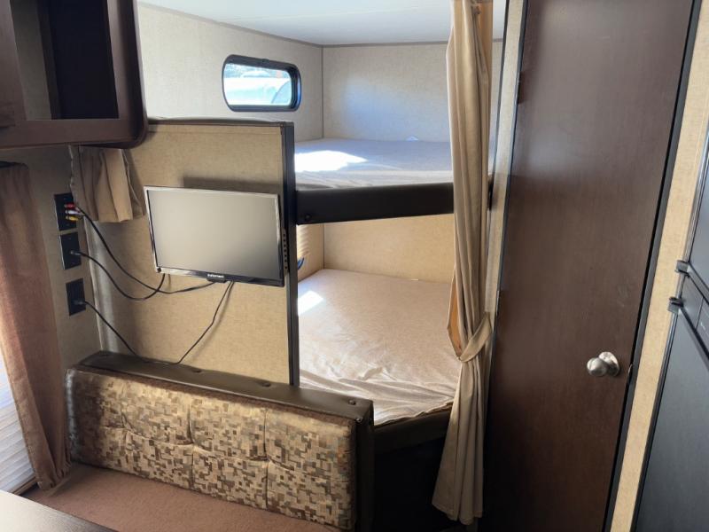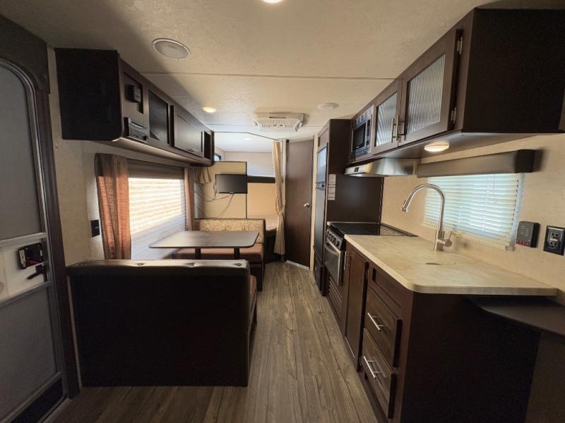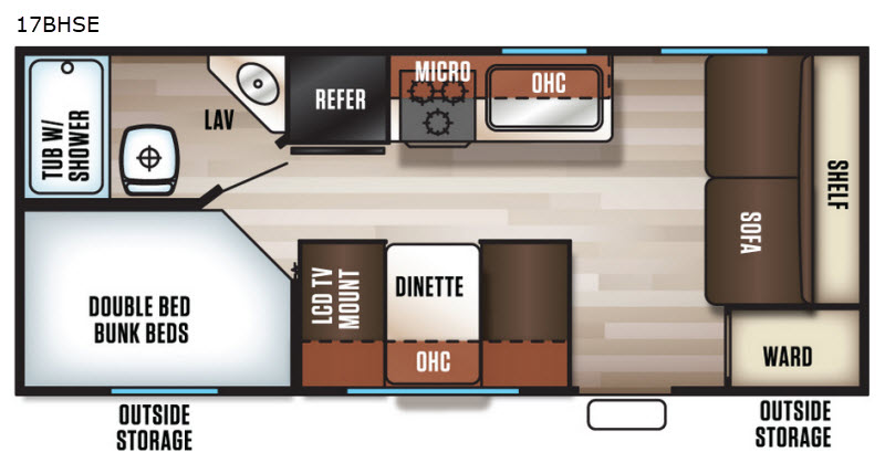 This Cherokee Grey Wolf SE model 17BHSE allows your family of five or six to easily camp and enjoy the outdoors. At night the double bed bunks will be a welcome space for up to four tired campers. The booth dinette and sofa can also be used as sleeping space for added family or friends when needed. You will appreciate the rear corner bath which features a tub/shower, toilet, and sink. Take turns each morning or at night getting cleaned up while the rest enjoy the view of your surroundings through the large side windows. There is even a view from each bunk. Overhead cabinets provide plenty of storage, plus there are both front and rear outdoor storage compartments as well.
