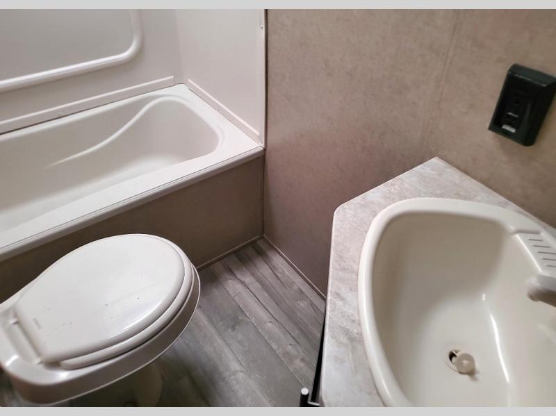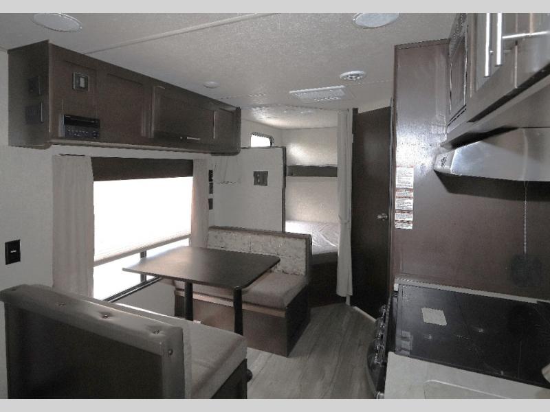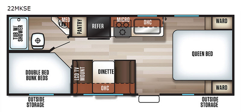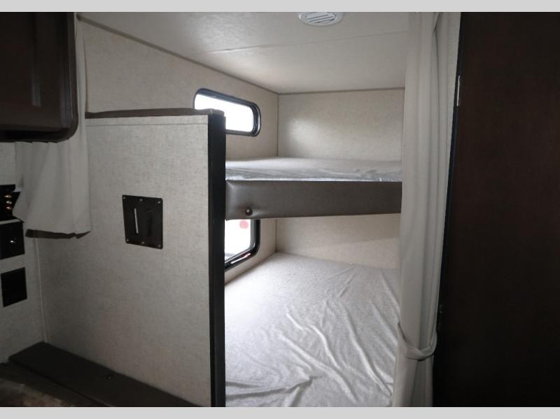 Double bed bunks and a queen bed allow you to sleep six comfortably, and with the booth dinette folded down you can even sleep one more added quest. This unit offers your larger family a great camping experience. You will find ample storage both inside and out with large overhead cabinets inside, plus wardrobes beside the queen bed up front. On the outside, there are storage compartments for your exterior camping gear in both the front and rear making it easy to stow away outdoor camp chairs and games that you can enjoy while hanging out under the 15' awning outside.