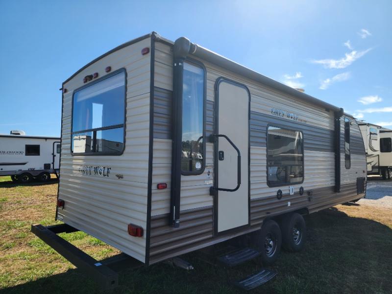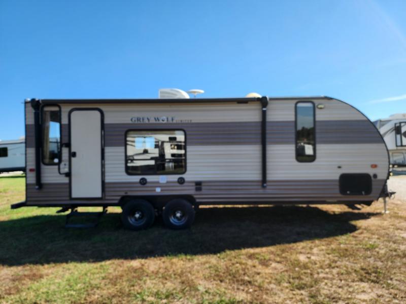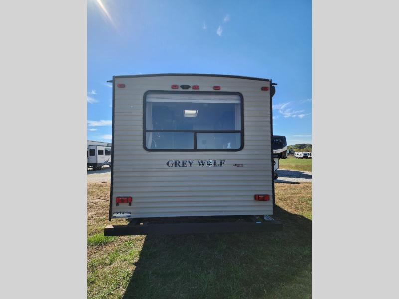 All Cherokee Grey Wolf models are quality built with distinct features and superior comfort in mind. And, they are all set at an affordable price point. So, when you get the opportunity to escape the hustle and bustle of everyday life and enjoy all the beauty and wonder that an outdoor adventure holds, the Cherokee Grey Wolf is ready and waiting to help you relax and unwind. Each unit features an aerodynamic radius front which improves towability, and you will have no trouble hitching up even in the dark with the lighted power tongue jack. The nitro filled tires help keep the tow going smoothly down the road even on a bumpy surface. Inside, you will enjoy comfortable furnishing, shaker style cabinetry, and large overhead cabinets for plenty of storage. There are two 20 lb. LP bottles, a patio awning for added outdoor living space, plus plenty of exterior storage for your camping gear. These units also offer solar prep for when you choose to do a little boon-docking off the beaten path, and they are also wired for a back up camera if you choose to add that option as well. Come choose one of the Cherokee Grey Wolf travel trailers or toy haulers, and let everyday life take a backseat so you can rest and unwind for awhile!
