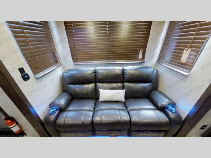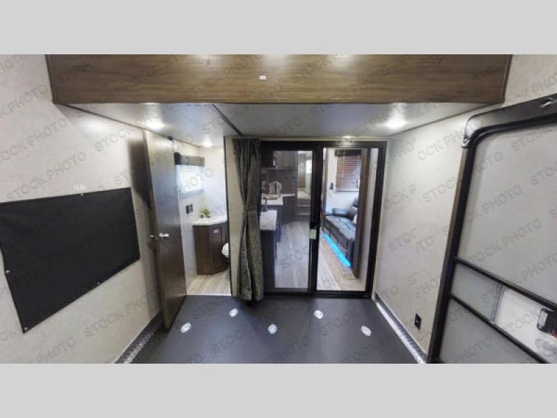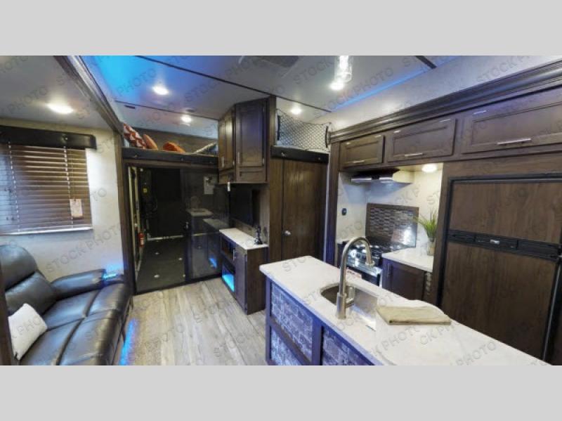 Come see just how fun and easy any camping trip can be with this double slide out Cherokee Wolf Pack 325PACK13 toy hauler fifth wheel. With the 13' of cargo space you can bring along a few dirt bikes, an ATV, or a four wheeler. After your gear is unloaded then set up the sofas. Above the sofas there is a Happijac power bed which offers sleeping space for two. Off of the cargo area there is a convenient half bathroom where you can clean up before coming into the main living area. Overlooking the kitchen and living area is the loft with a queen bed. At night you can retreat to the private front bedroom which features a queen bed with storage below and more!