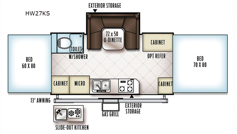 If you want a luxurious camping experience then pop into this Forest River Flagstaff High Wall HW27KS folding pop-up camper! It features a front king bed and a rear queen bed for sleeping. There is also a U-shaped dinette that you can eat your meals at or convert into an extra sleeping space. The grill master of your group will enjoy cooking on the outdoor gas grill with work table. LED lighting brightens your way to a good camping trip!