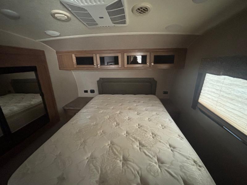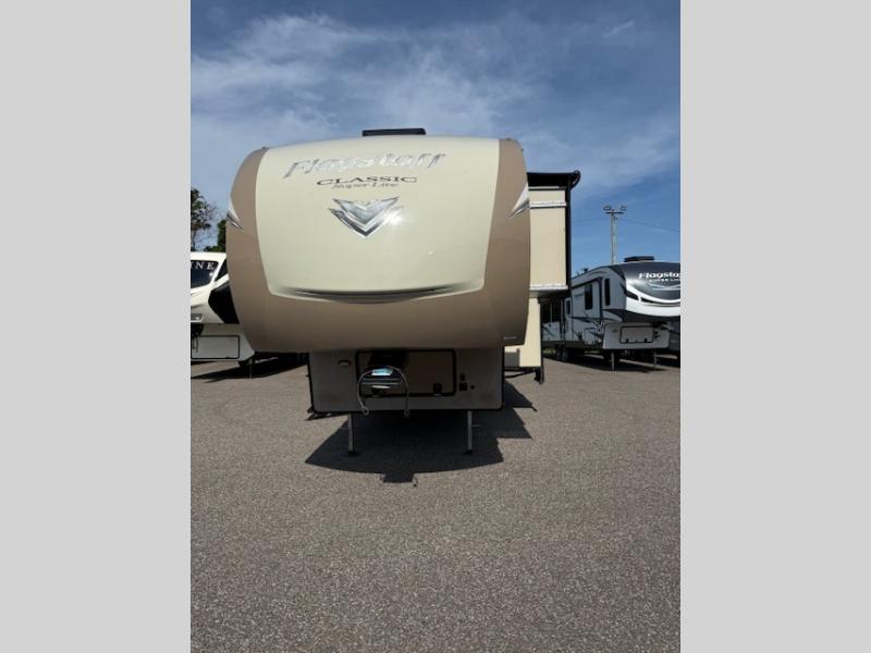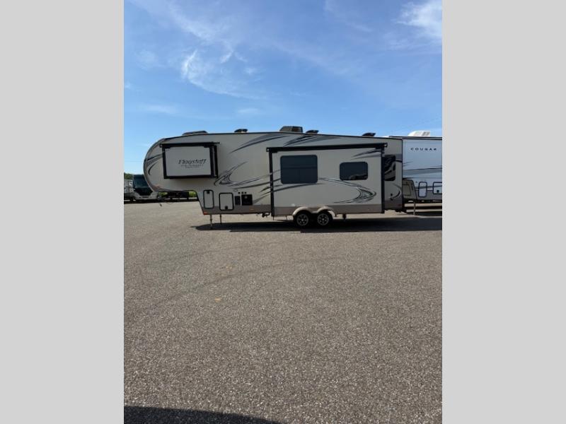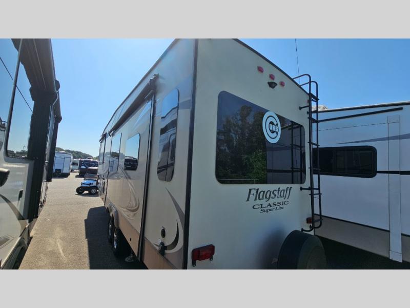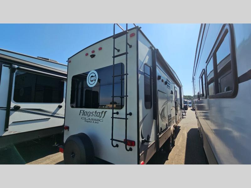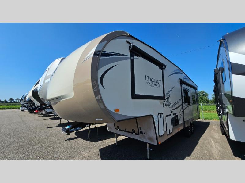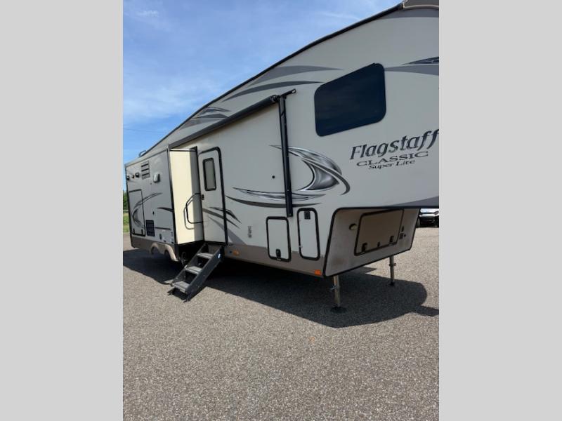 It will be easy to make plenty of memories with your family when you choose to camp with a Flagstaff Super Lite fifth wheel.These models have a beautiful Driftwood interior with solid wood and raised panel doors and drawers. Enjoy the 32" LCD TV with premium soundbar, plus the recessed ceiling LED 12V interior lighting throughout. Along the exterior there is a fully aluminum frame, radius roof with interior vaulted ceilings which gives you the most headroom, plus large dinette picture windows where you can sit and enjoy the view. The Standard Packages offer features such as a WiFi ranger WiFi booster, an enclosed underbelly, a power awning with adjustable rain dump and LED light strip, a rear observation camera prep with molded mounting plate, and so much more!