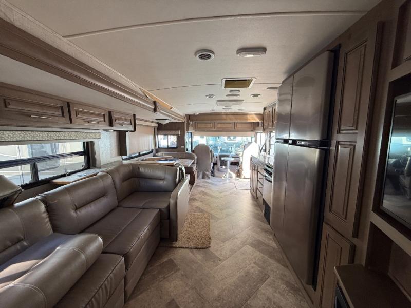 For comfort and style you will want a Forest River Georgetown 5 Series GT5 class A motor home. Along the exterior there is a "Super Storage" rear cargo compartment, an outside shower, as well as a stylish fiberglass front cap with lighted logo, LED accent lights and automotive bonded front windshield. As you step inside be prepared to be wowed from the stainless steel three-burner cooktop with oven to the solid surface countertops. In the cockpit there is a custom dash with ABS side consoles, drink holdrers, and a 110V outlet/USB. You will also enjoy the convenience of the MyRV touchscreen with wireless technology and more!