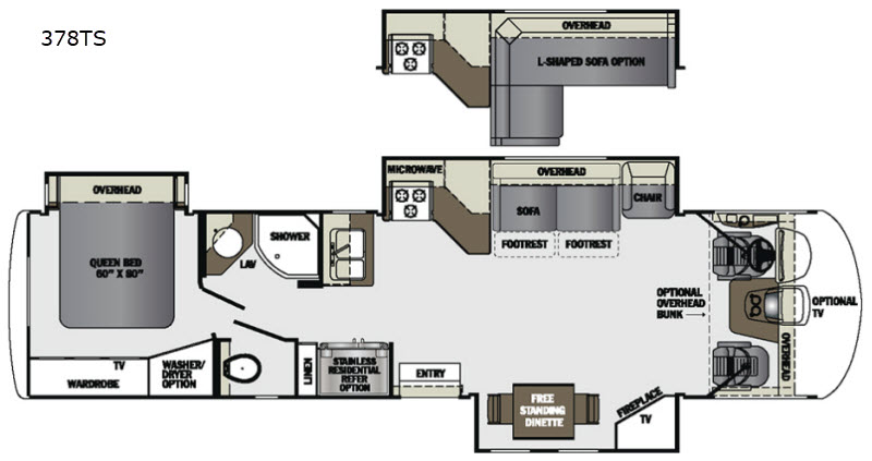 For your next camping trip whether near or far you will want this spacious triple slide out Georgetown XL 378TS motor home by Forest River. Once you reach your destination then come relax in the living area where you will find a sofa with footrests and across the room there is a TV and a fireplace. The private rear bedroom has a queen bed, a large wardrobe, and you can choose to add an optional washer and dryer. Above the cab you can add an optional bunk and an optional TV.