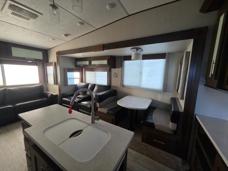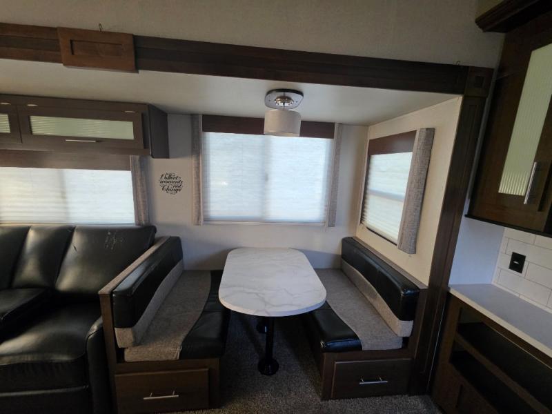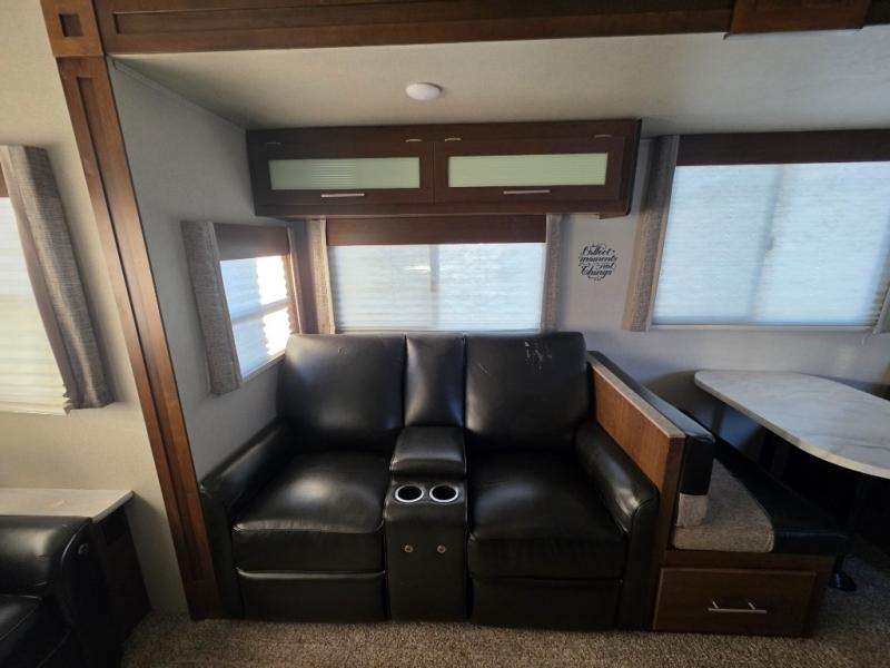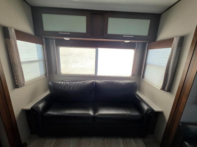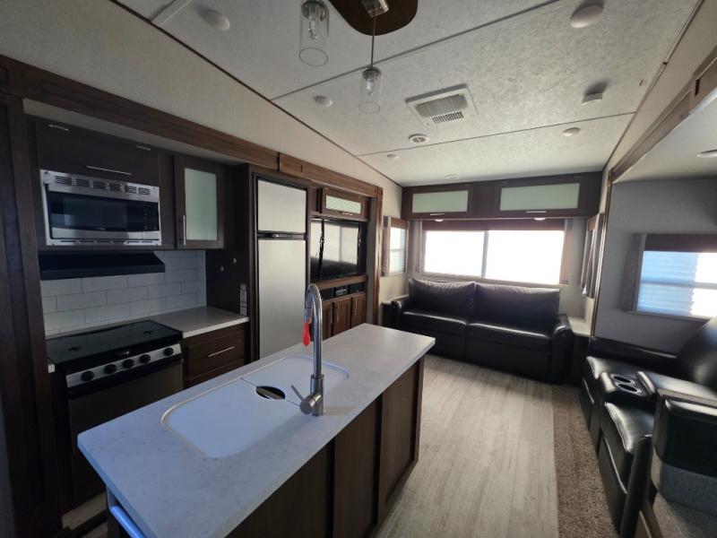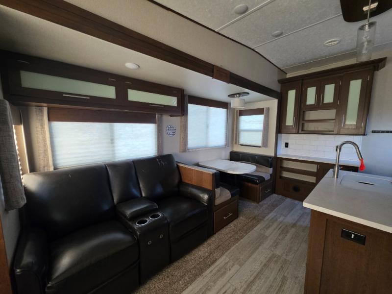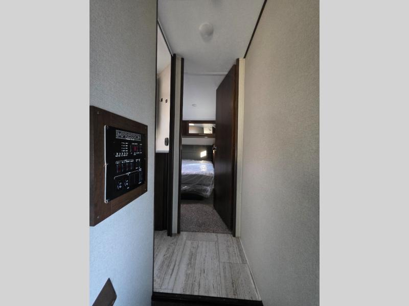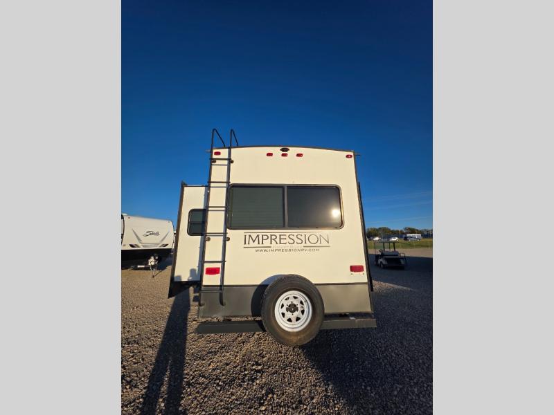 If you have been wanting to explore the state camp grounds with the luxury of home then take a look at this Impression fifth wheel 28RSS. The rear living area includes conveniently placed USB charging ports on both the sofa and the theater seats allowing you to keep your electronics charged the whole trip. You will find plenty of storage, and square footage thanks to the dual slide outs in the living and kitchen area. You can watch the 40" TV or connect to the Bluetooth capable radio all while cooking in the fully equipped kitchen including a hutch and center island or relaxing on the furniture. This popular Impression floorplan offers even more for you to enjoy!