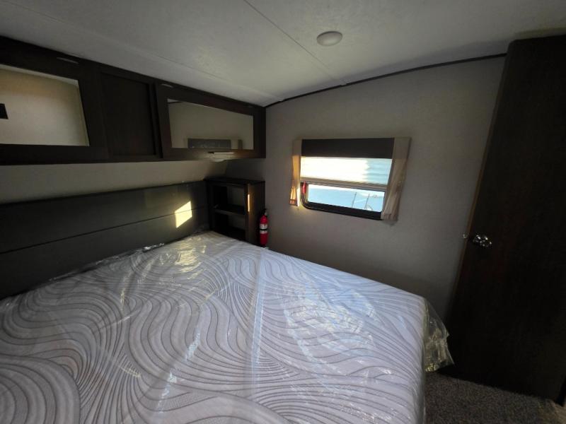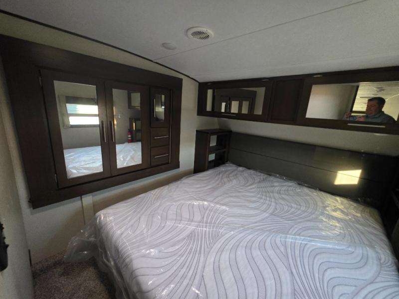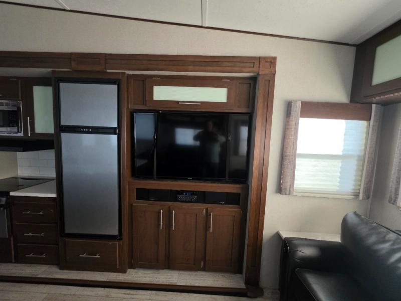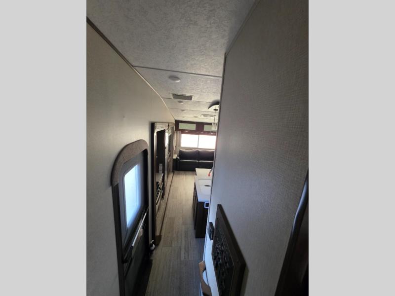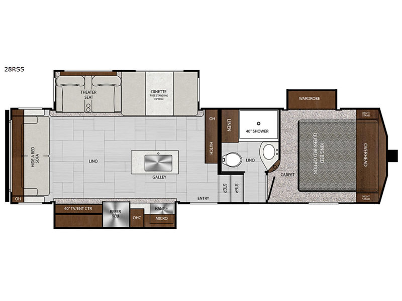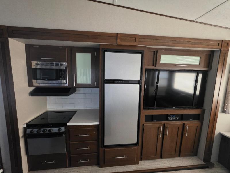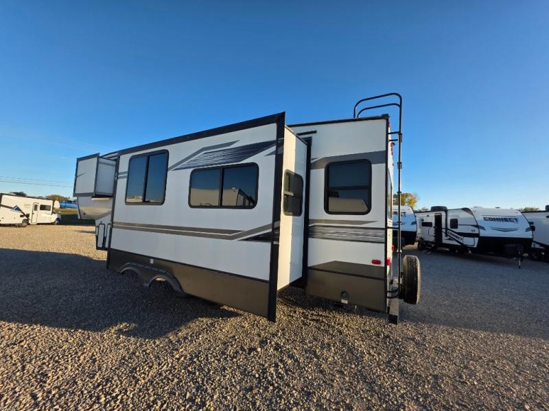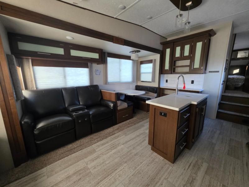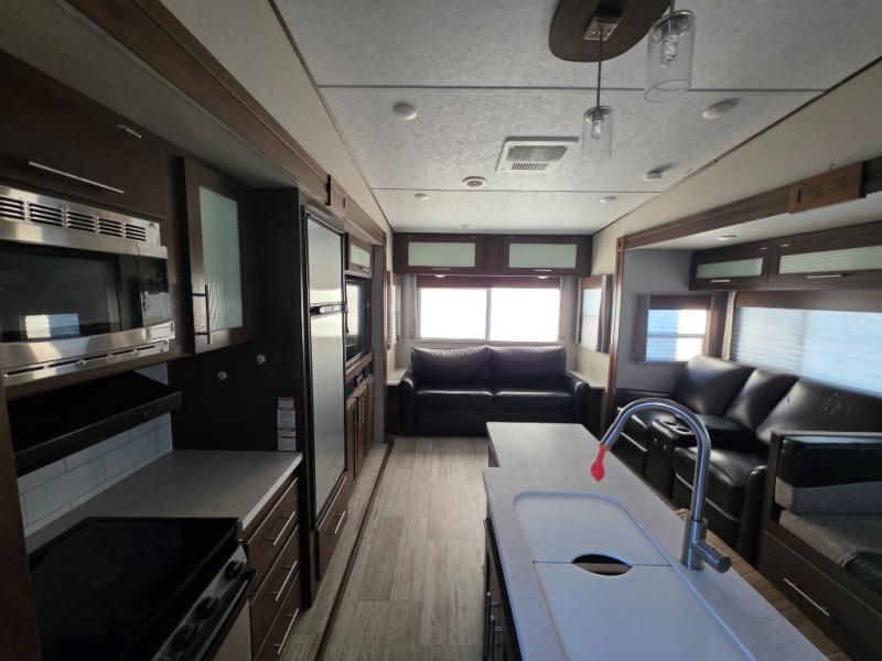 If you have been wanting to explore the state camp grounds with the luxury of home then take a look at this Impression fifth wheel 28RSS. The rear living area includes conveniently placed USB charging ports on both the sofa and the theater seats allowing you to keep your electronics charged the whole trip. You will find plenty of storage, and square footage thanks to the dual slide outs in the living and kitchen area. You can watch the 40" TV or connect to the Bluetooth capable radio all while cooking in the fully equipped kitchen including a hutch and center island or relaxing on the furniture. This popular Impression floorplan offers even more for you to enjoy!
