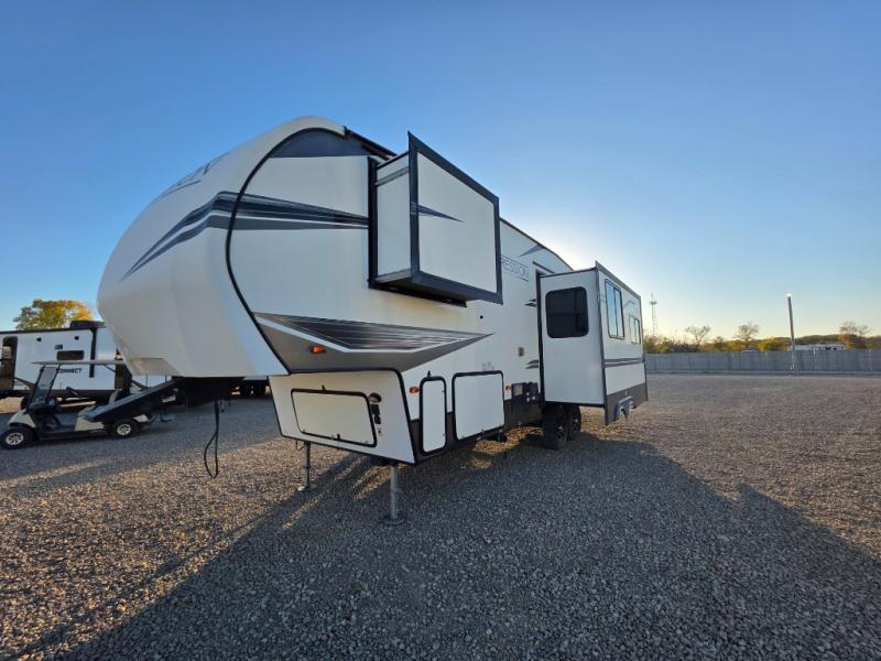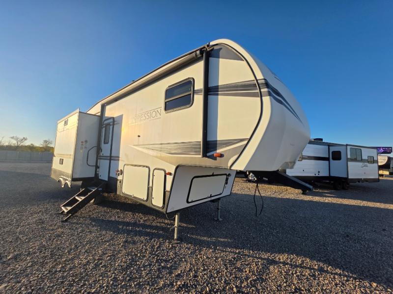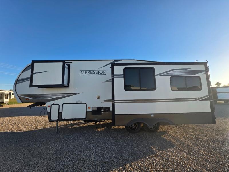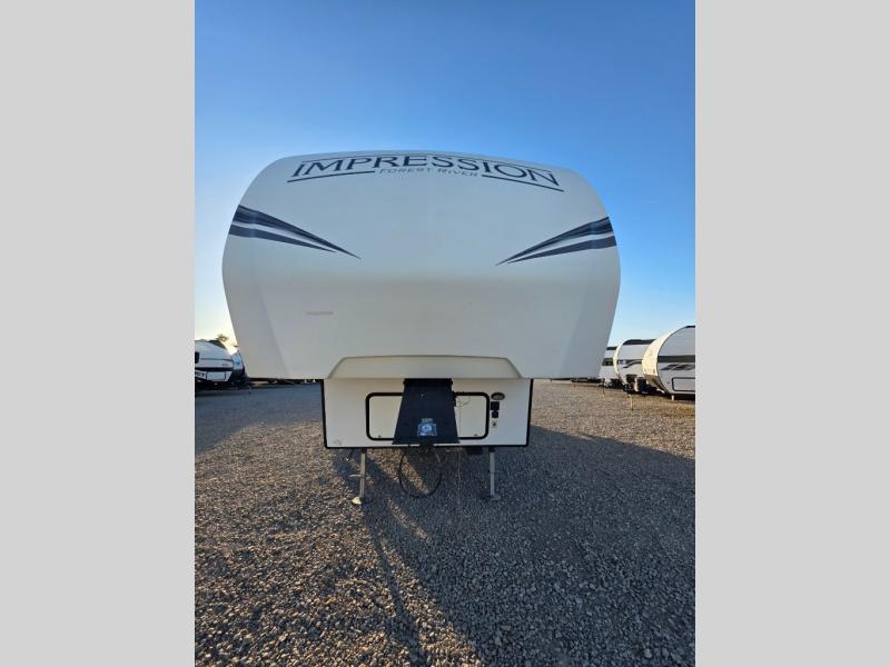 You will find modern styling and a wide open design in each Forest River Impression fifth wheel. The high-end luxury features inside include residential Shaker style Artisan cabinet doors, solid wood core cabinet frames, premium residential furniture, and a designer headboard for the king size bed in the front flush floor master suite to mention a few highlights. Rest assured the exterior provides years of enjoyment. From the Dexter axles with the industry-leading 5 year warranty, energy efficient gel coated fiberglass exterior, solar prep, and backup prep to the free Coach-Net Emergency Roadside Assistance and free Forest River Owner's Group Membership, you will love your new fifth wheel. It's time to make your first Impression a lasting impression on everyone that sees you!