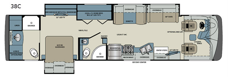 | TV Info | LR 32" LED TV, BR 28" LED TV, Bunk Area (2) 20" LED TV's, Exterior 32" LED TV |