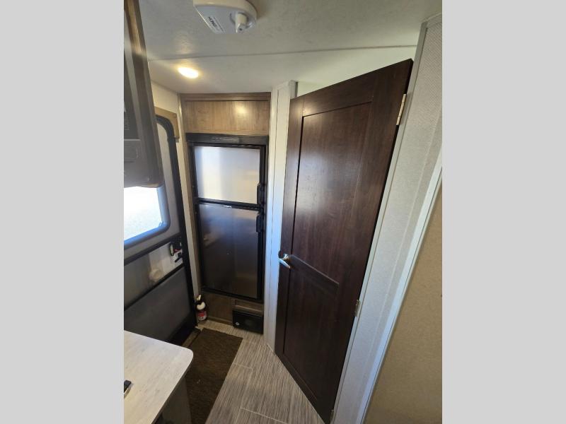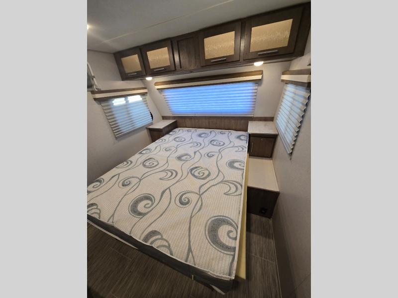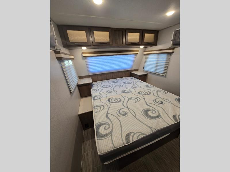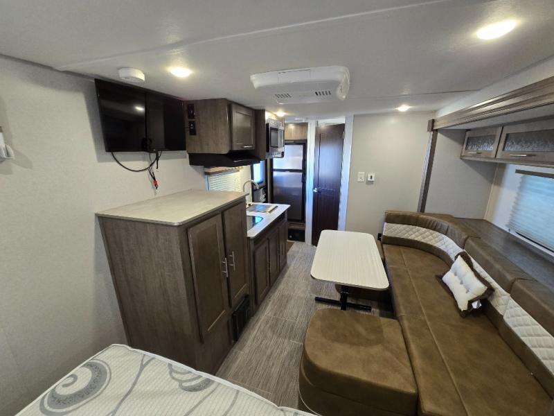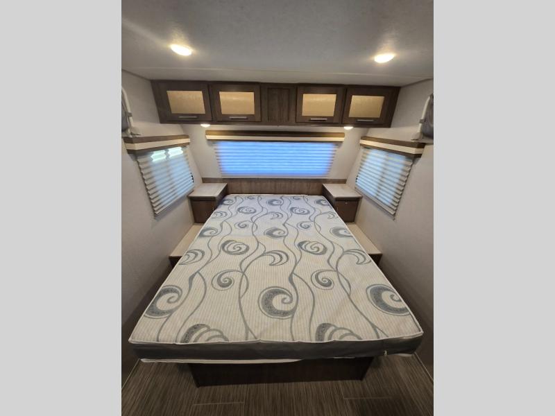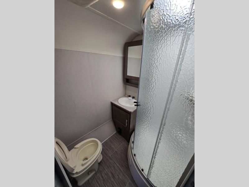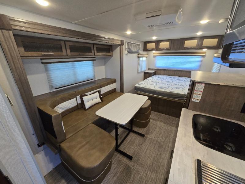Coming in just under 5,000 lbs., this No Boundaries travel trailer by Forest River has just what you need for any adventure you happen upon! You will appreciate the rear corner dry bath in this unit that offers a radius shower, toilet, and sink. This unit also features one roadside slide out chaise lounge for comfortable seating, and a 60" x 80" queen size bed up front with super storage beneath. There is also a complete kitchen setup with a refrigerator, a single stainless steel sink, a two-burner cook-top with glass cover, and a pantry for all of your non-perishable food items. This unit also features a front pass-through storage compartment that is perfect for all of your outdoor camping gear like fishing poles or hunting gear! You will also appreciate the featured USB charging station for all of your electronic charging needs.