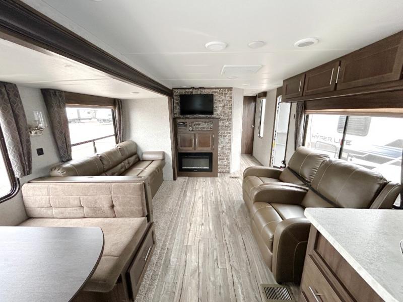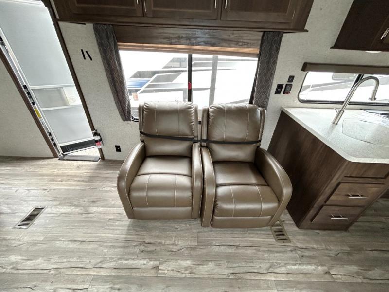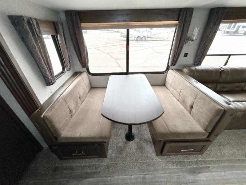 In the living area, there are two standard chairs just to the left of the entry door. An entertainment center and more linen storage are along the interior wall of the living space. The side opposite of the entry door includes a slide out. It has a sofa and a booth dinette.