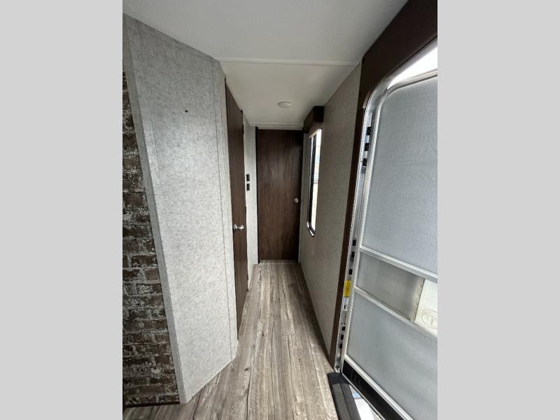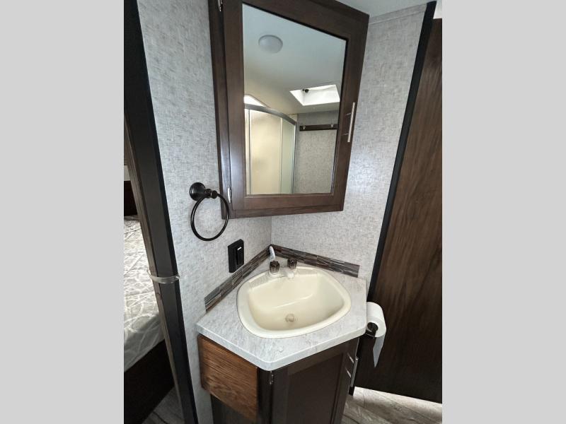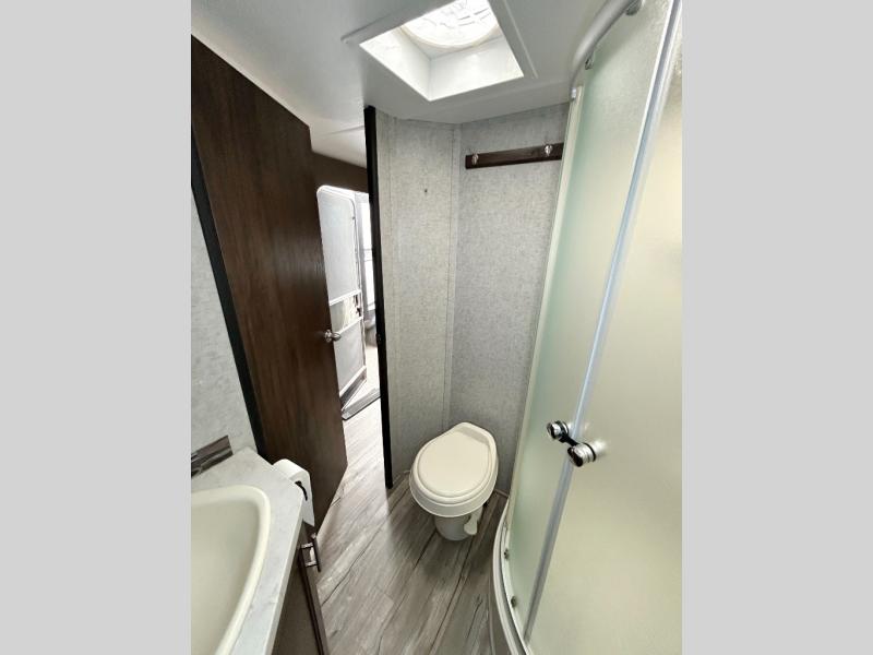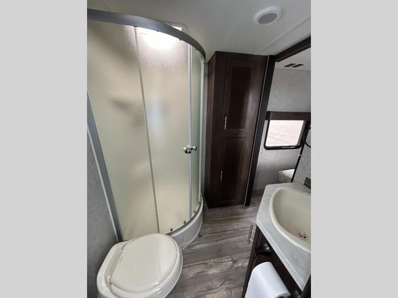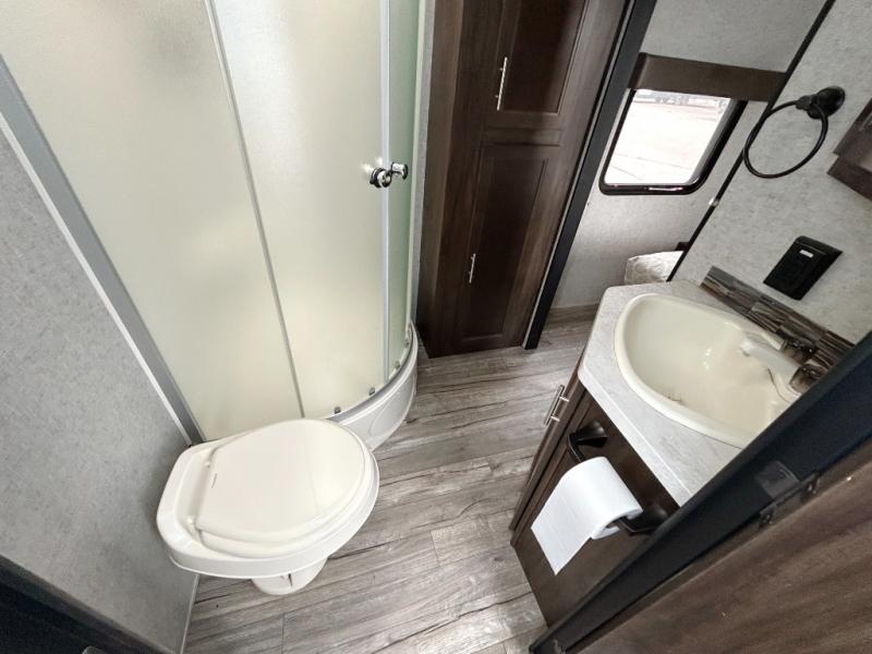 As you enter this travel trailer, a side aisle bathroom includes a toilet, corner shower, linen storage, and a corner vanity sink. It also includes a pocket door for entry to the bedroom.