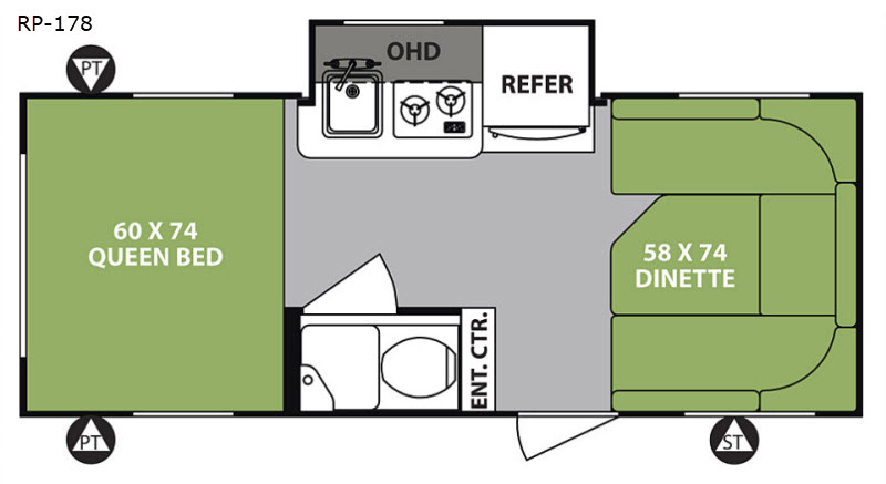 This R-Pod travel trailer model 178 by Forest River is a great camping unit for a family of four. You will enjoy the extra floor space thanks to the single slide out along the roadside. After you set up camp then come enjoy the comforts throughout this model. You can eat your meals at the 58" x 74" dinette and if extra sleeping space is needed then you can convert this area into a bed. In the rear there is a queen bed for mom and dad. An added feature is the handy wet bath, plus along the exterior you will find plenty of storage space!
