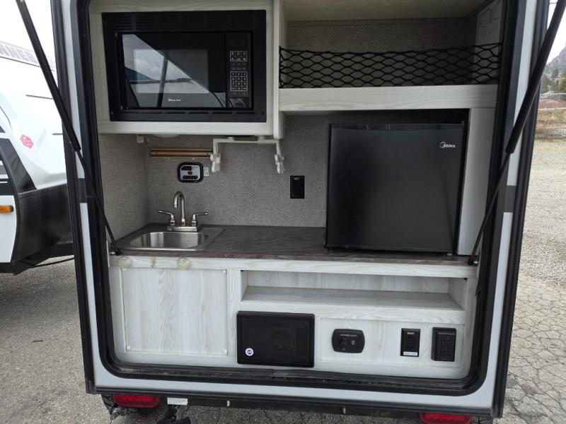 This Rockwood Geo Pro 12RK travel trailer can easily be pulled behind just about any vehicle. For the adventurous couple who loves to get up and go, then this model is the answer to your traveling needs! There are two entry doors for easy access to each side of the 54" x 74" bed. You can enjoy the entertainment center, and store your items in the overhead cabinets at the foot of the bed. If you like to cook in the great outdoors then the outside kitchen featuring a microwave, sink, refrigerator, and storage that is perfect for you.