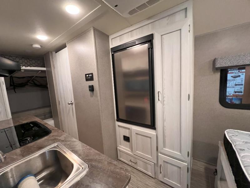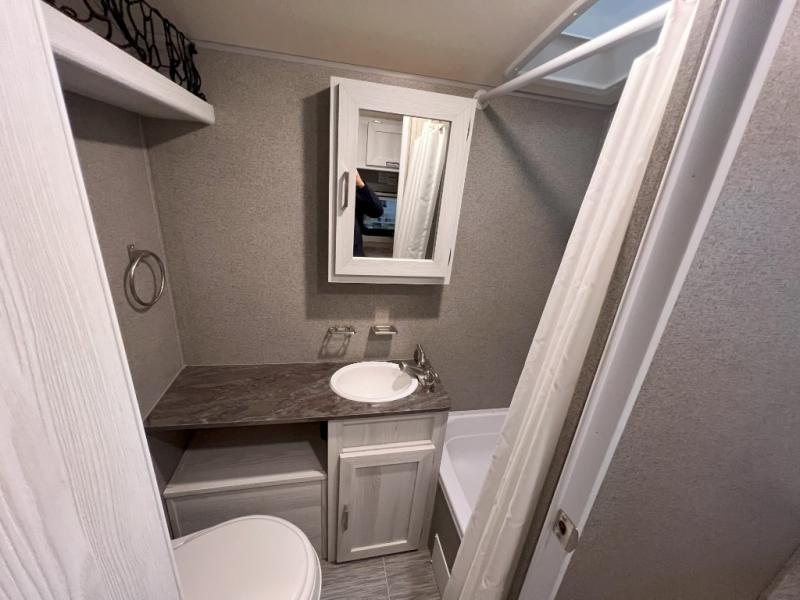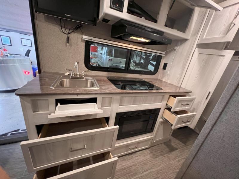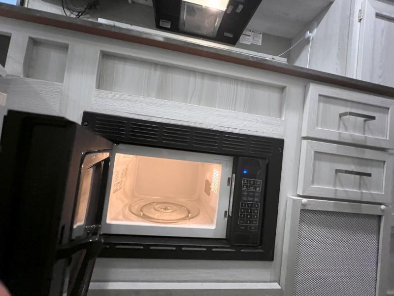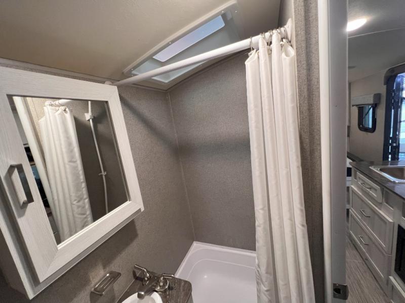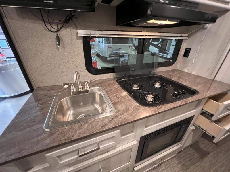 This trailer makes mealtime easy, whether you’re inside or out. Cook with the recessed cooktop with flush-mount cover, microwave, or take the fun outdoors with the included gas grill. A kitchen pantry and dual wardrobes provide space for dry goods, utensils, and clothing.