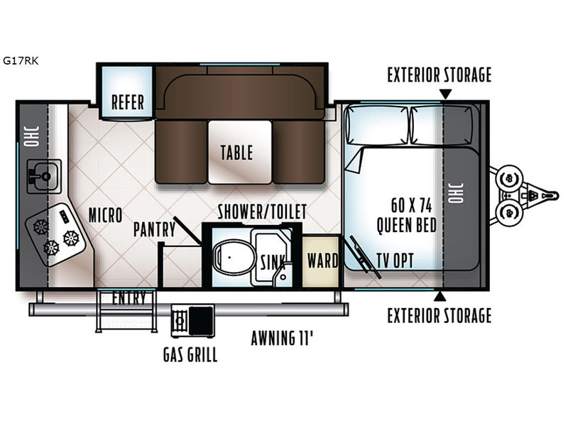 When you are ready to camp with comforts of home, then load up your necessary belongings in this Rockwood Geo Pro 17RK. You will find that the single slide out provides more floor space between the front and rear of the trailer to move about without having to squeeze in. You will not have to use the public facilities thanks to the wet bath in this trailer. The u-shaped dinette provides a space to dine, play games, and sleep at night if you need more sleeping space than the front queen bed provides. You will find storage throughout including inside the pantry next to the entry, and the wardrobe next to the bed. You can cook inside on the recessed cooktop with flush mount cover and in the microwave along the rear, or outside on the gas grill, plus more!