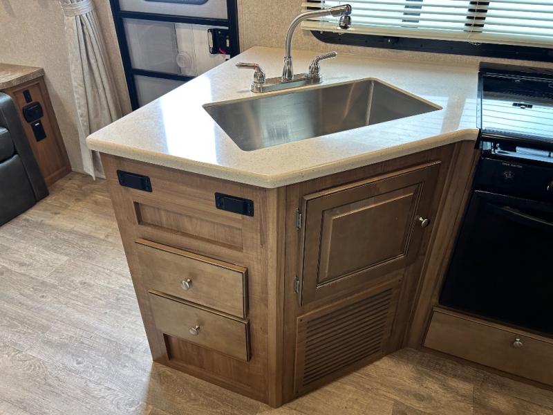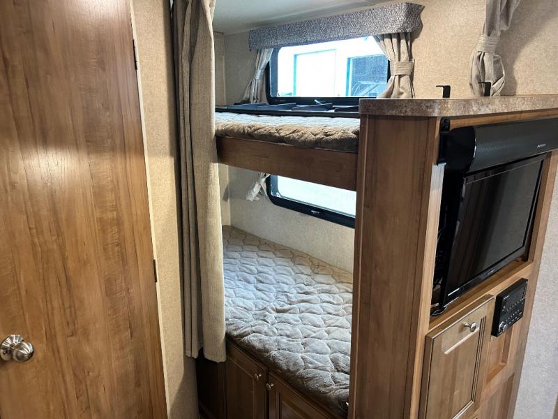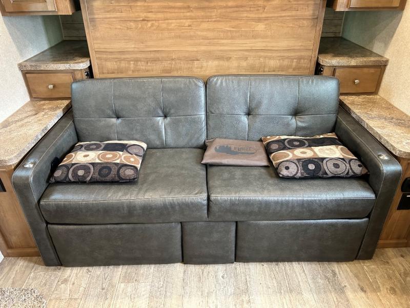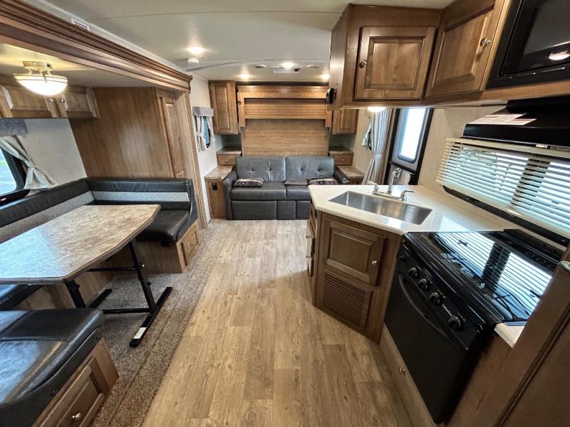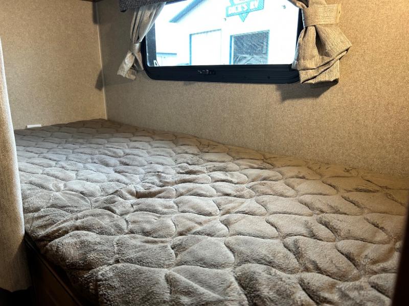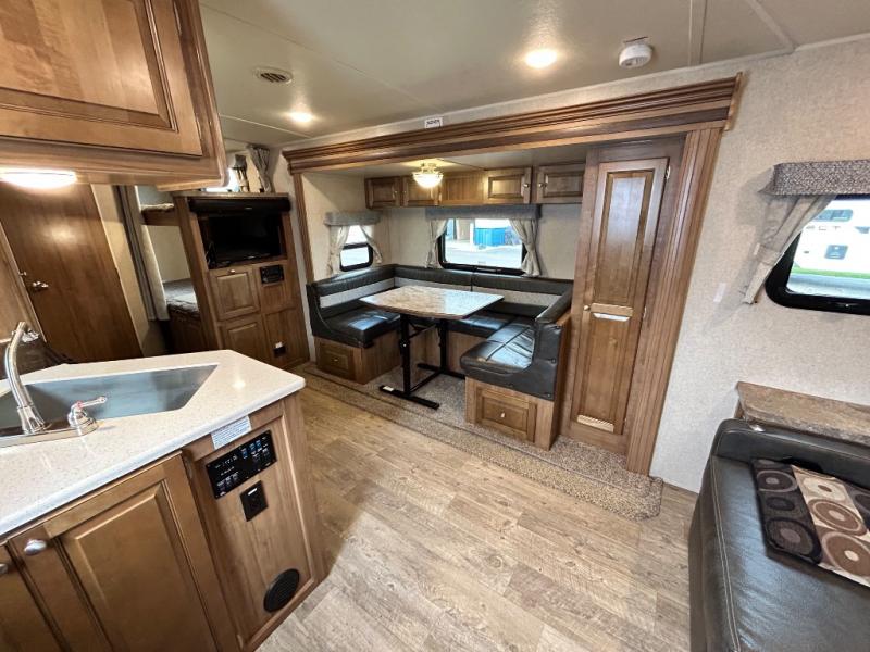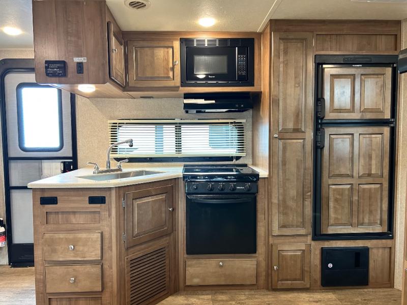Model 2405S has a slide out along the roadside which allows for more of an open floor plan and gives you more walking around space. There is a bunk bed in the rear for the children or the guests that may stop by. The sofa/Murphy bed combination will also give you a bit more room in this model. Don't forget to check out the outside features which include the 17' awning and the gas grill for cooking up some awesome summertime meals.