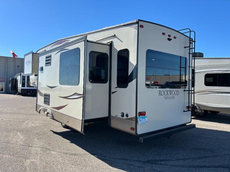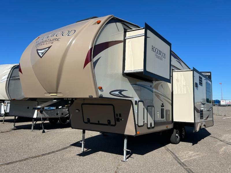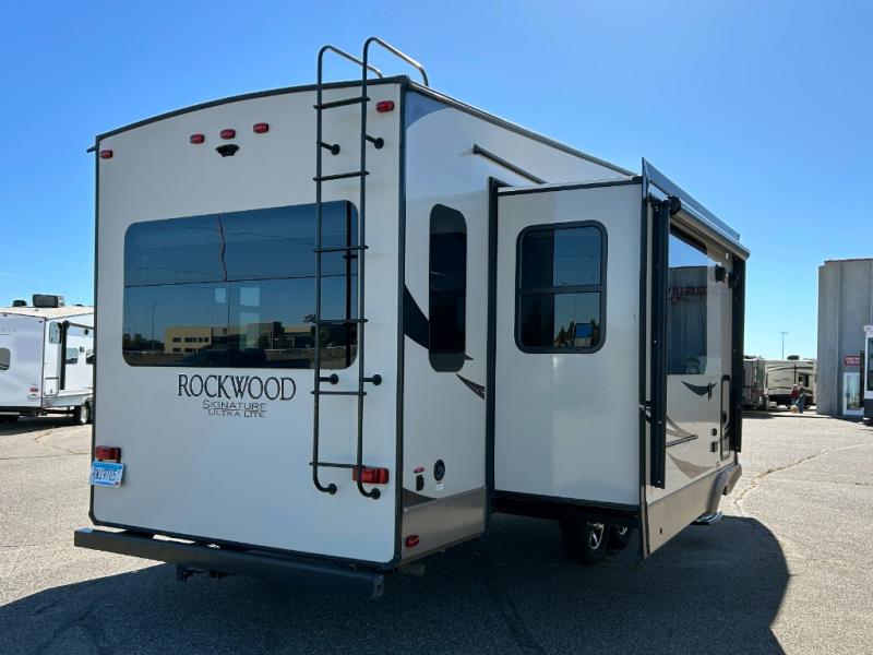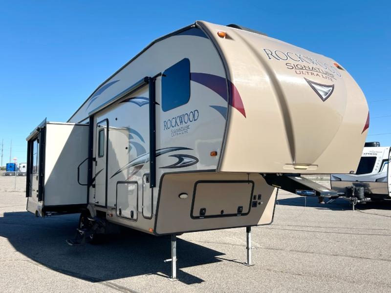 The Forest River Rockwood Signature Ultra Lite fifth wheels are anything but ordinary. You will love all of the space inside each model! Once you step inside you will find Driftwood cabinetry, solid wood and raised panel doors and drawers, plus LED lighting throughout. Outside there is a power awning with adjustable rain and dump plus LED lights and a seamless one piece roof, plus more! Each model also includes a Standard Package which features the following an automotive windshield, an upgraded 22" gas oven, solid surface Corian kitchen countertops, outside speakers, and so much more! Why wait? Get your Rockwood Signature Ultra Lite fifth wheel today!