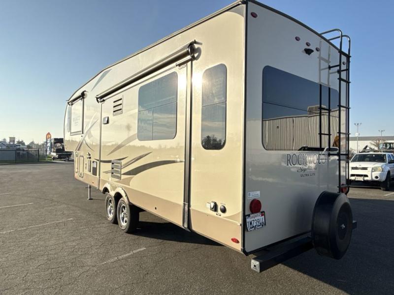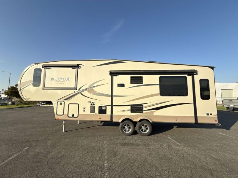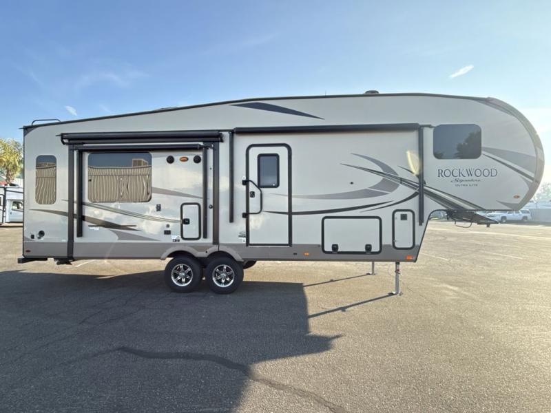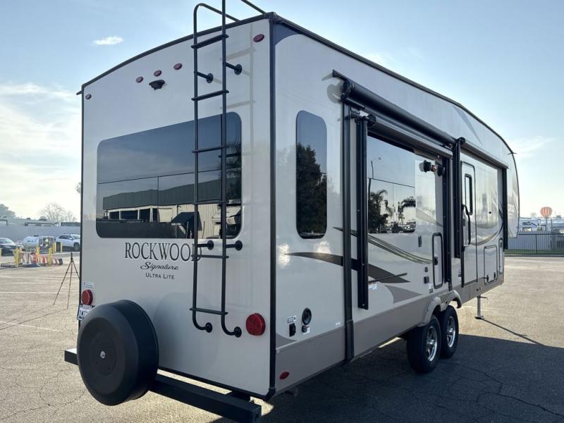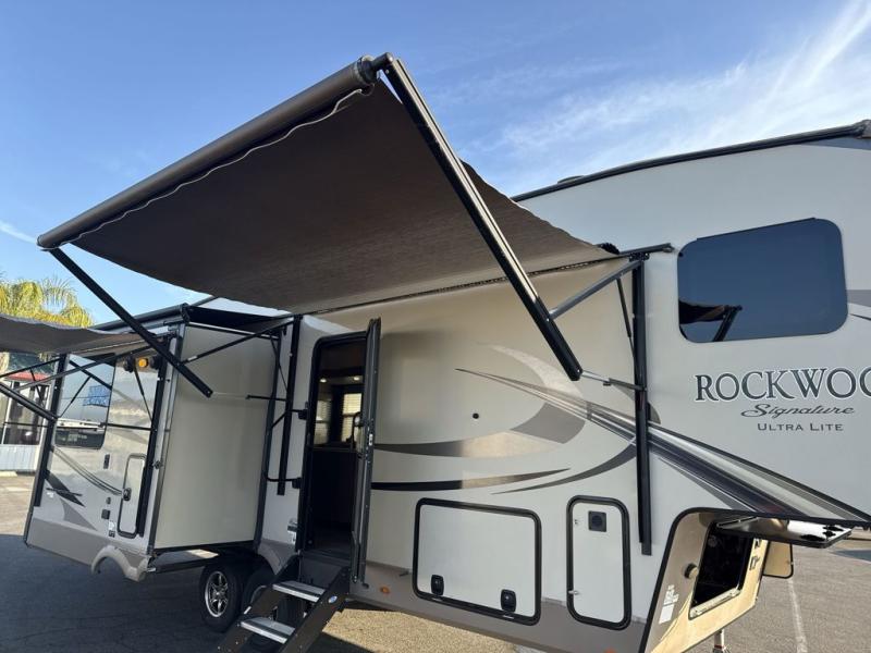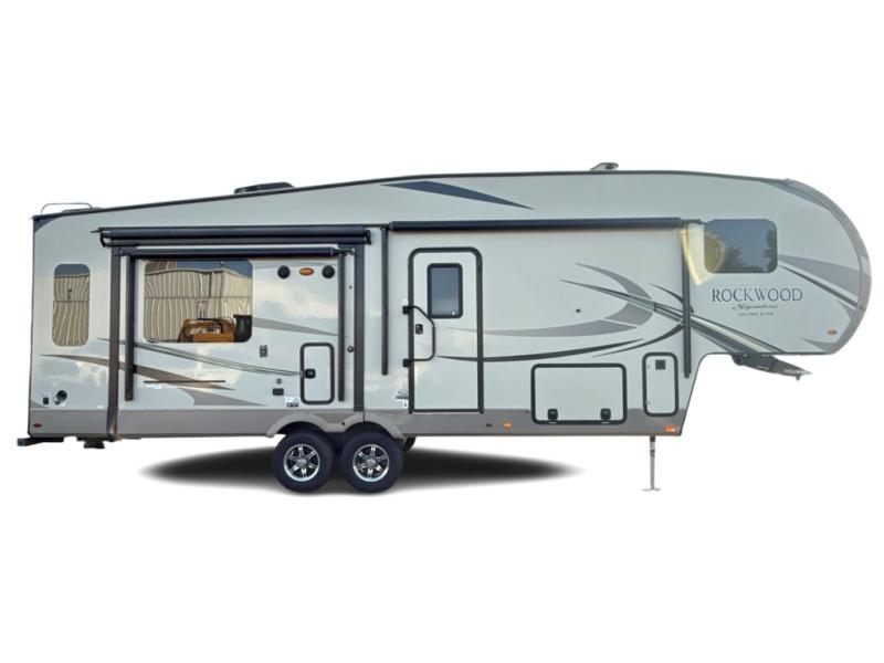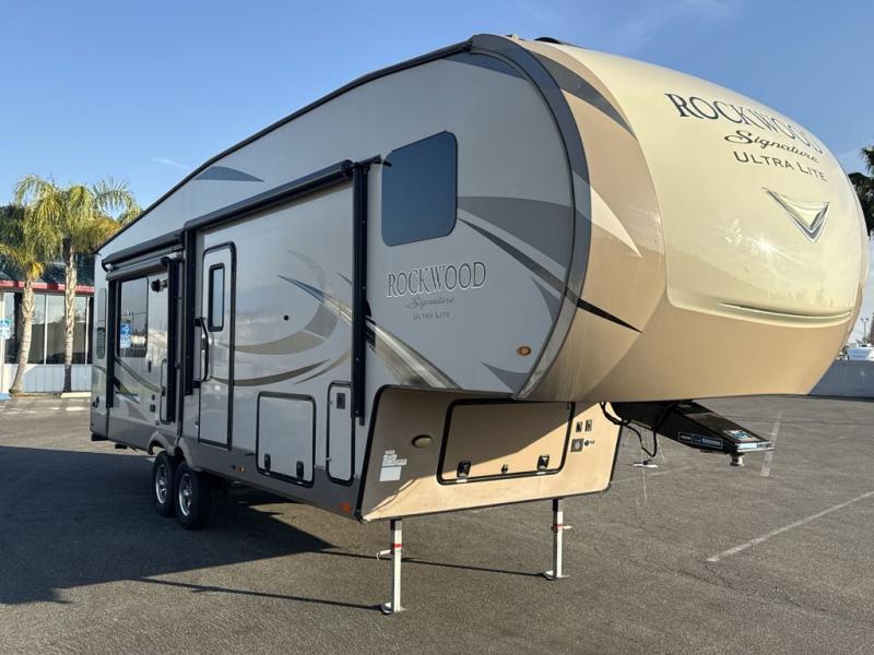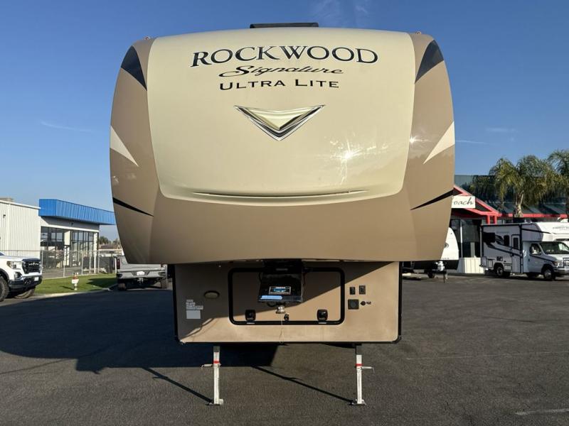 The Forest River Rockwood Signature Ultra Lite fifth wheels are anything but ordinary. You will love all of the space inside each model! Once you step inside you will find Driftwood cabinetry, solid wood and raised panel doors and drawers, plus LED lighting throughout. Outside there is a power awning with adjustable rain and dump plus LED lights and a seamless one piece roof, plus more! Each model also includes a Standard Package which features the following an automotive windshield, an upgraded 22" gas oven, solid surface Corian kitchen countertops, outside speakers, and so much more! Why wait? Get your Rockwood Signature Ultra Lite fifth wheel today!