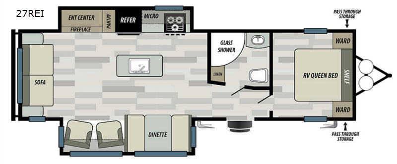 Come start your next camping trip with comfort and ease when you have this 27REI travel trailer by Forest River. This Salem model features dual opposing slide outs which help to open up the floor space. Along the rear wall there is a sofa. More seating can be found at the two lounge chairs and dinette within the curbside slide out. In the evening you can have a fire in the fireplace while you watch TV at the entertainment center. Everything that you need to create your meals can be found in this kitchen from the three burner range to the island with a double sink. Outside enjoy the spacious pass-through storage area for all of your extra camping gear.